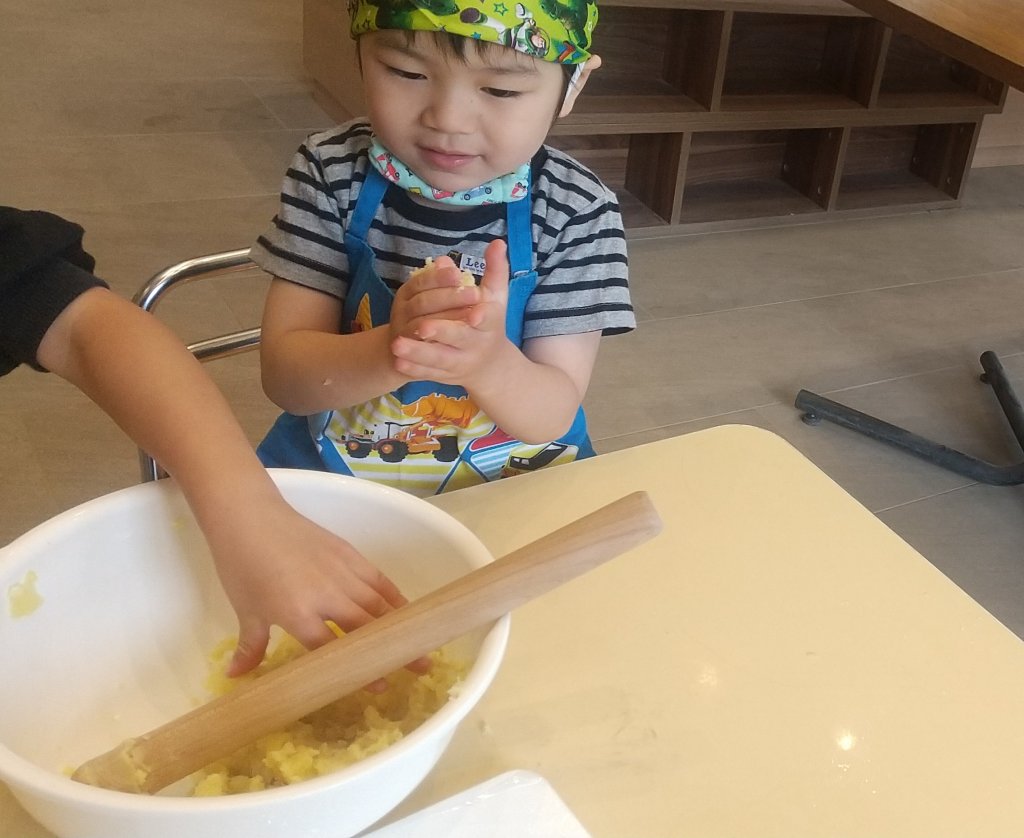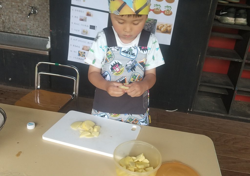 クッキングでは、グループによって調理内容を変えて「じゃがバターグループ」、「芋餅グループ」に分けて行いました。じゃがバターグループでは、じゃがいものみで食べたいという声も聞かれ「そしたらじゃがバターじゃなくてじゃがだまっていうクッキング名にしようよ」など、一つの食品から調理方法、調理名など食への興味関心を持つ様子が見られました。