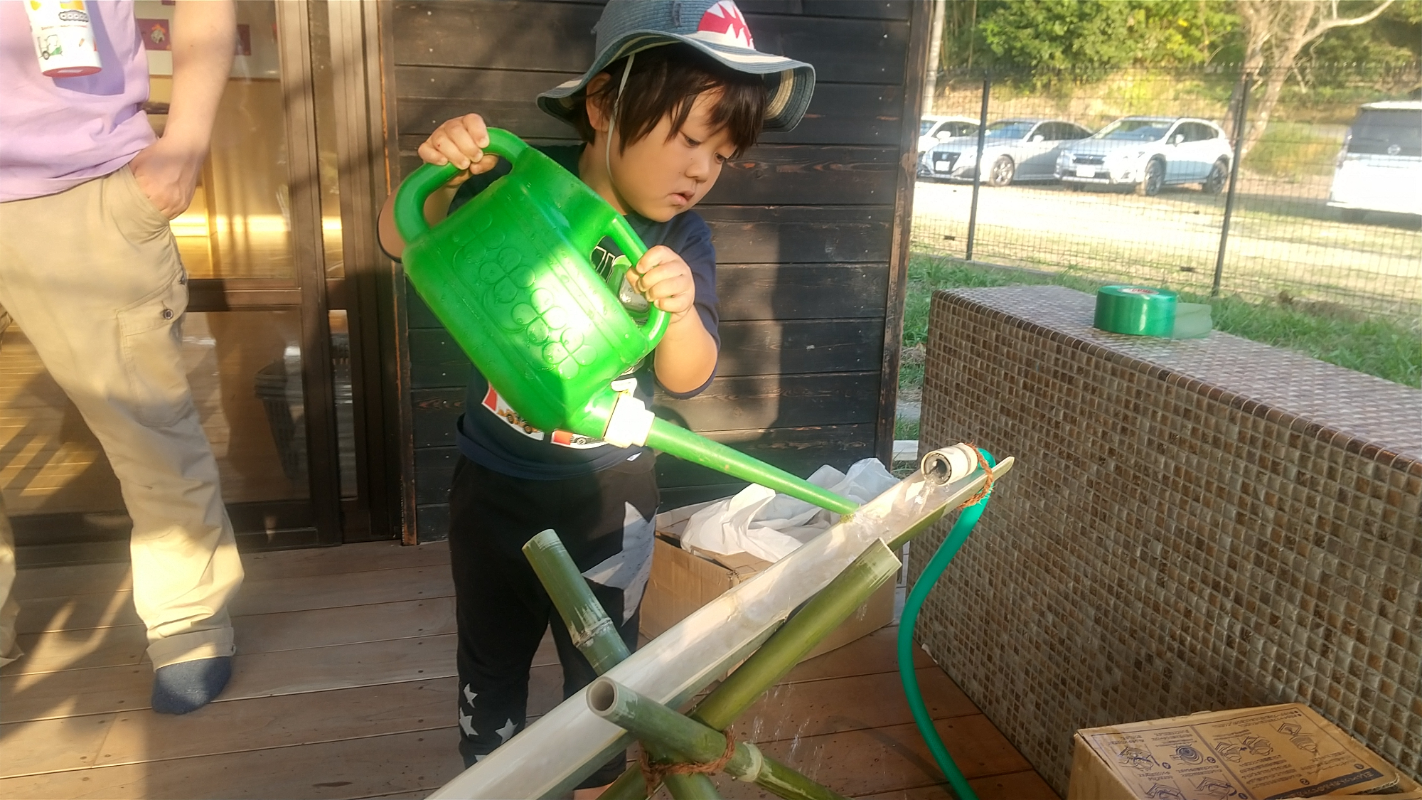 散歩から保育園に戻ると、今歩いてきた散歩道を竹や廃材を使って再現しました。今回のメインだった川は竹で表現し、ペットボトルや牛乳パックなどの廃材を使って魚や船を作りました。また散歩中に拾った落ち葉が流れるかの実験もしました。保護者の方にすずらんテープを細く切ってもらい流しそうめんに見立てて流してみるなど、保護者の方を含めた参加者全員で協力して色々な遊びへと広げることができました。