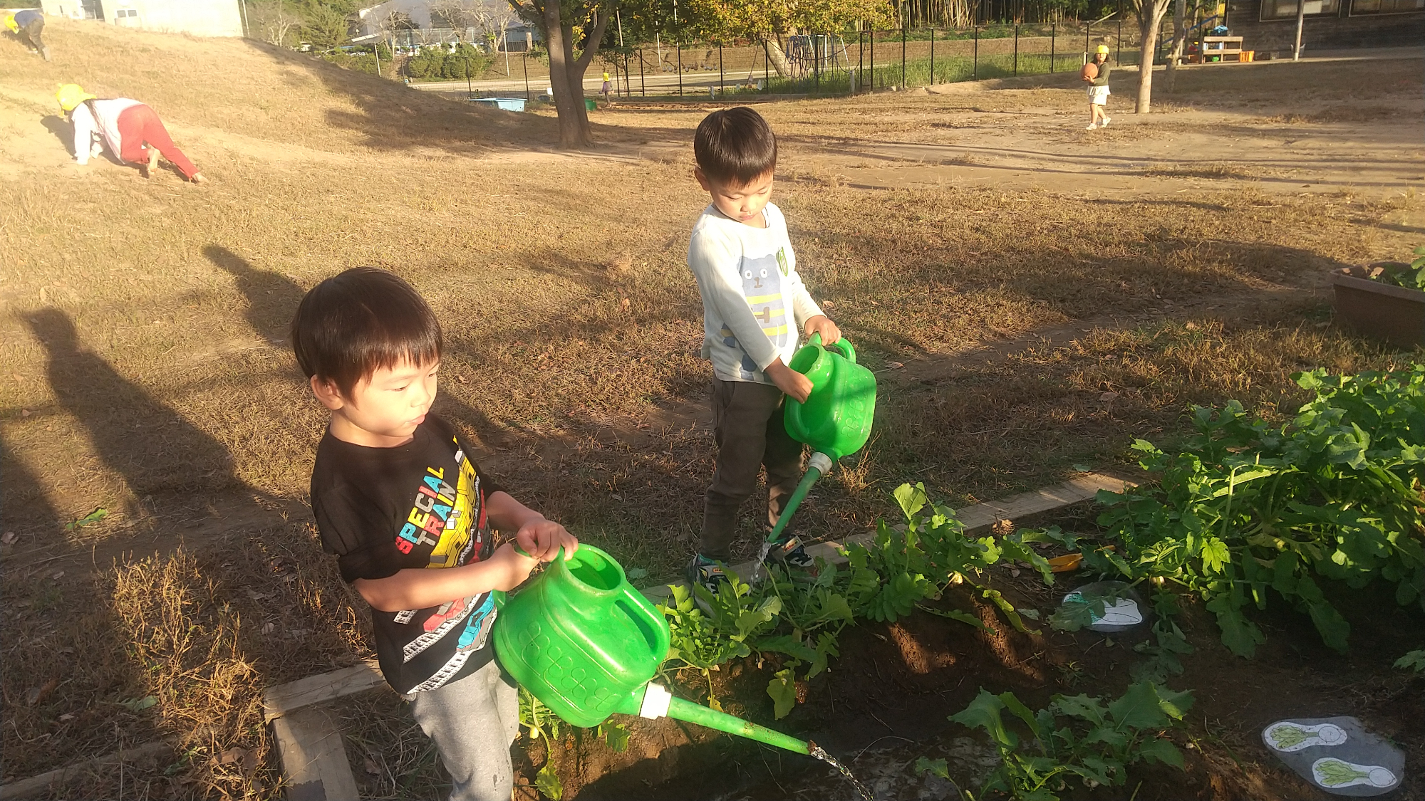 水やりをしながら口ずさむ子どもたち。野菜が大きくなるにつれて、子どもたちも畑仕事にますます熱が入ります。
