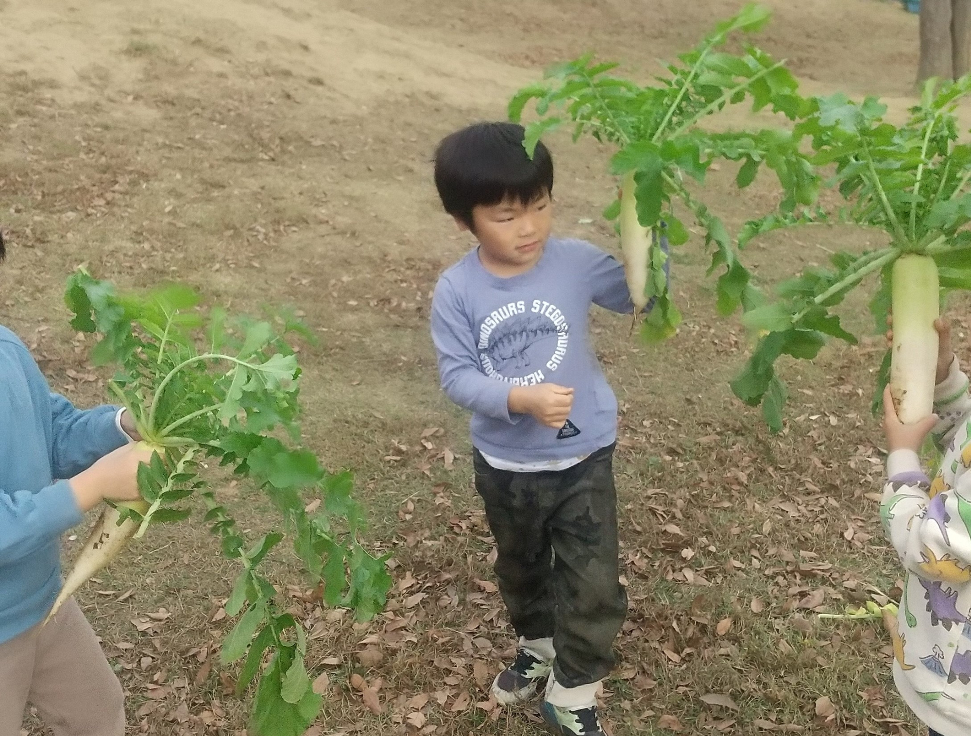 11月中旬、いよいよ収穫です。土の中から顔を出した大根を力いっぱい引き抜きます。 収穫した大根の大きさを比べる姿がありました。