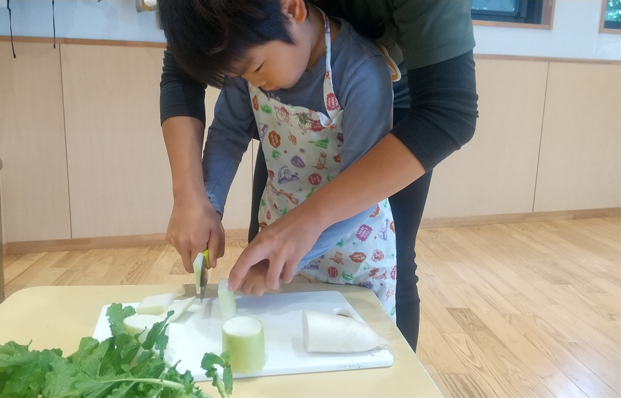 大根を切る子どもたちの眼差しは、とても真剣です。どのくらい力を込めればうまく切れるのか力加減を調節したり、同じ大きさに切るためにはどのくらいの幅で切ったら良いか、距離感や向きを調整したりと、包丁の操作ひとつをとっても、培われる力がたくさんあります。
