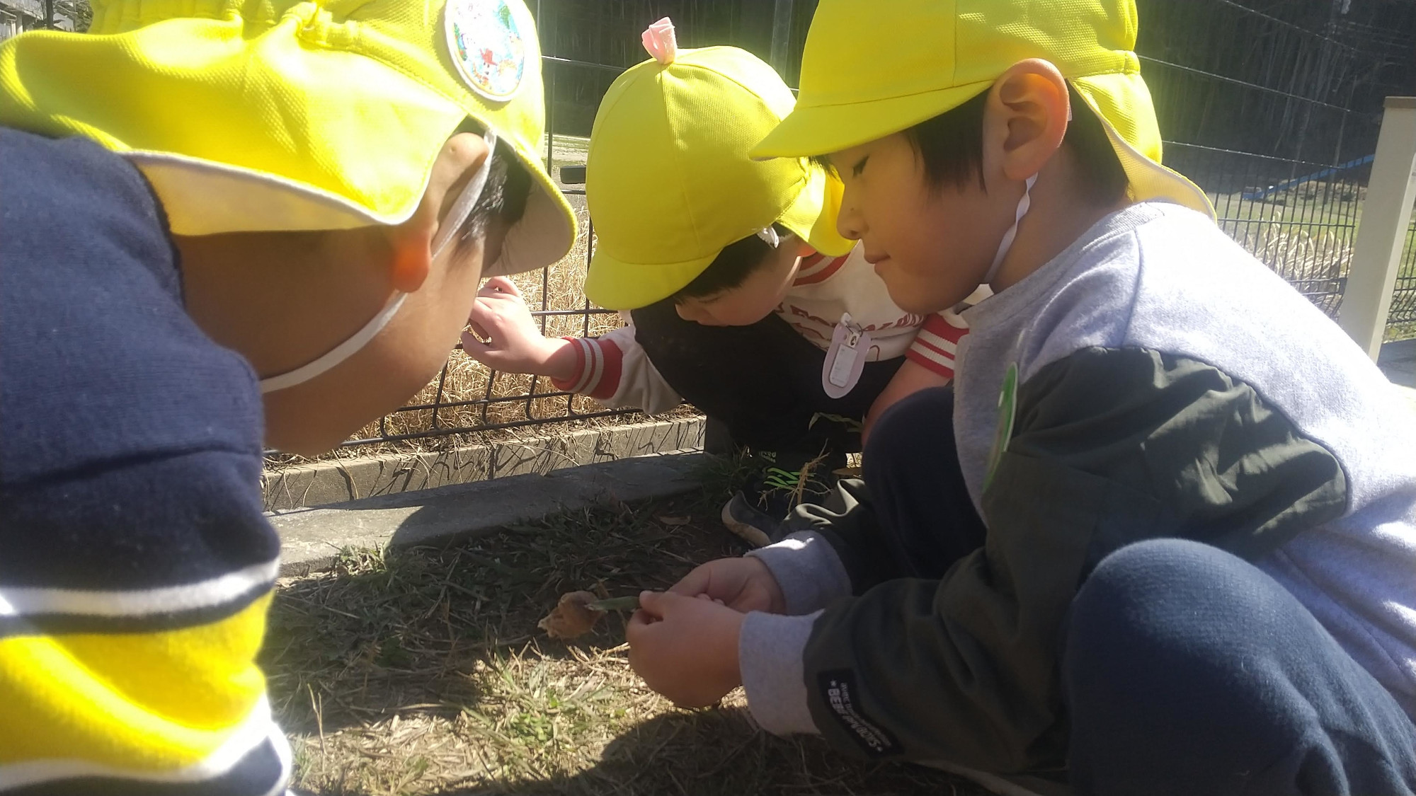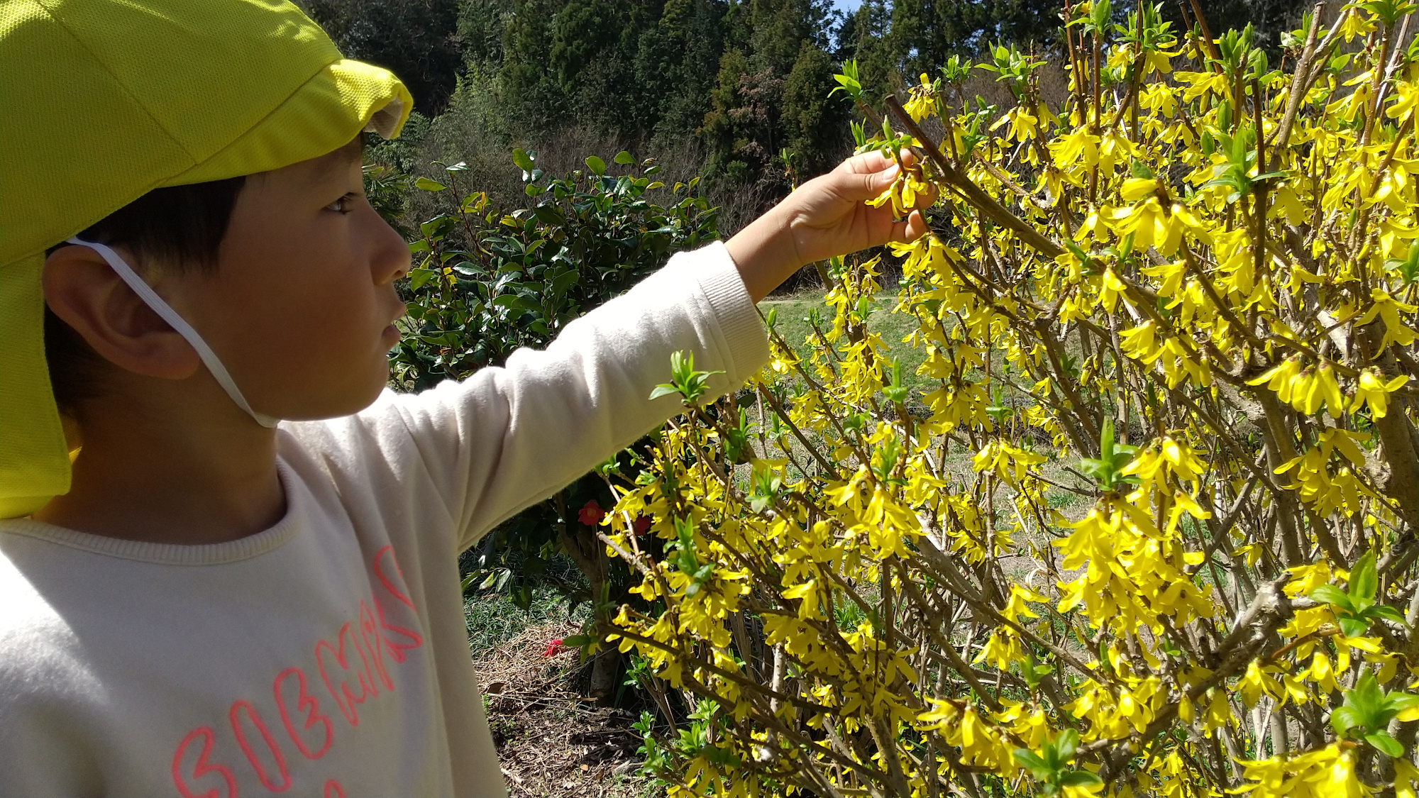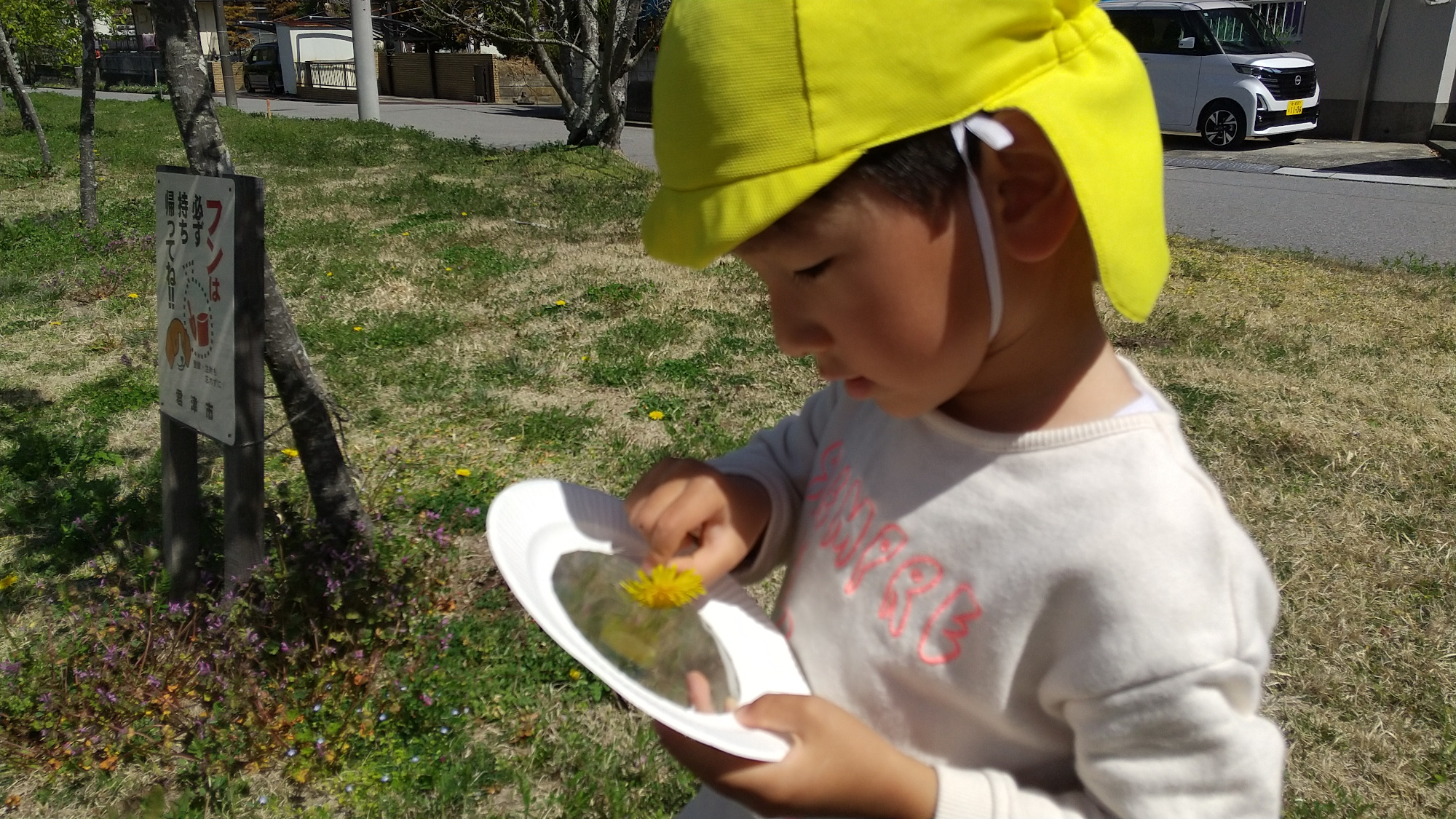 「今日も散歩、行けないね」と、とても淋しそうに縁側から外を見ている子どもたちです。そんな中の晴れ間を見つけて、散歩に出かけるとたくさんの春を見つけることが出来ました。