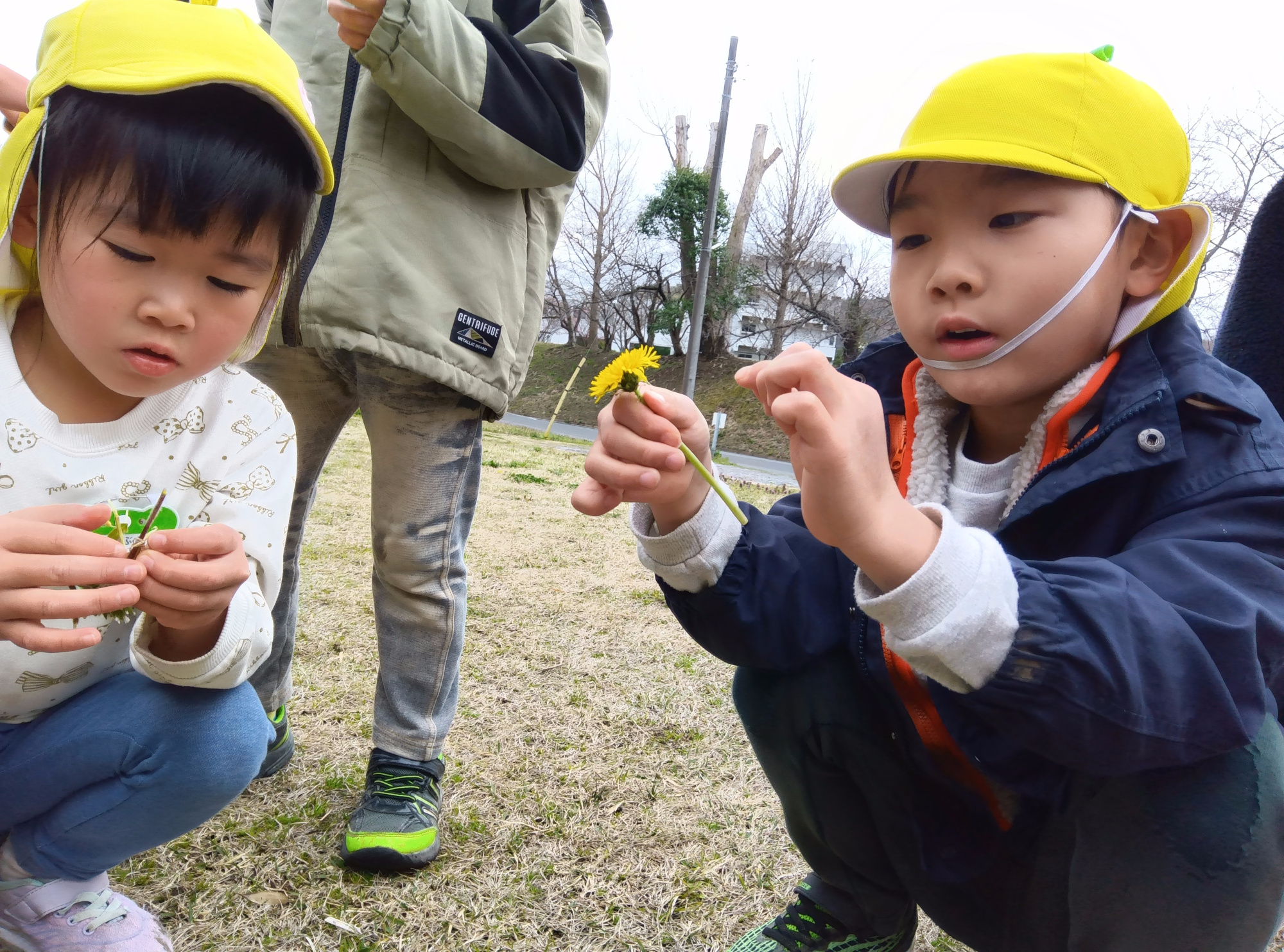 雨上がりで気温が高かった日、たくさんの草花が、つぼみを付けたり、タンポポがたくさん咲いたりしていました。色とりどりの花を見つけ、大喜びで友達と見せ合ったり、たくさん集めてお土産にしたりして、楽しみました。