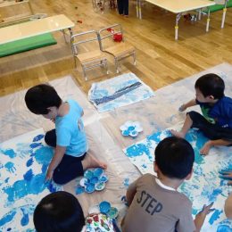 紙皿の真ん中をくり抜いて、OPPテープを貼り、そこに、摘みたての草花を貼っていきました。色とりどりの草花を見つけては、丁寧に摘み取って、大切そうに貼っていました。OPPテープに貼るのもなかなか難しく、思っていたところに貼れなかったり、くっ付いてしまったら離れなくなってしまったりと、少々困っているところもありましたが、とても集中して楽しんでいました。
