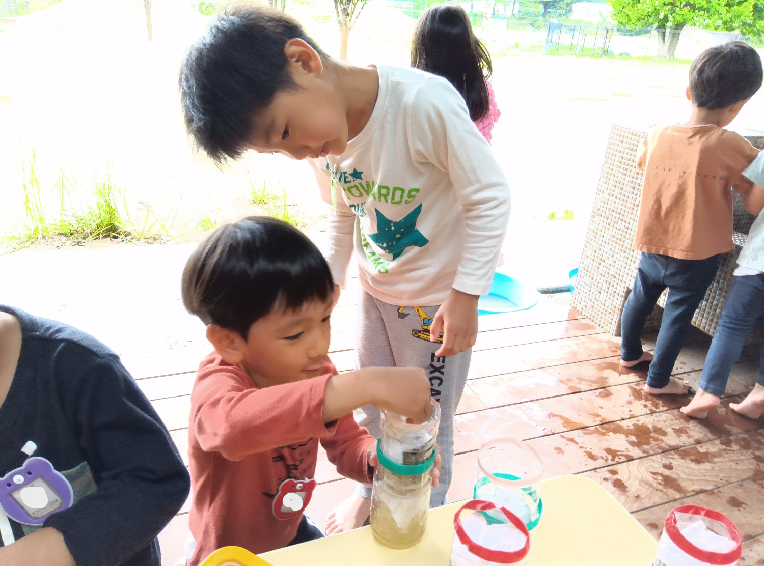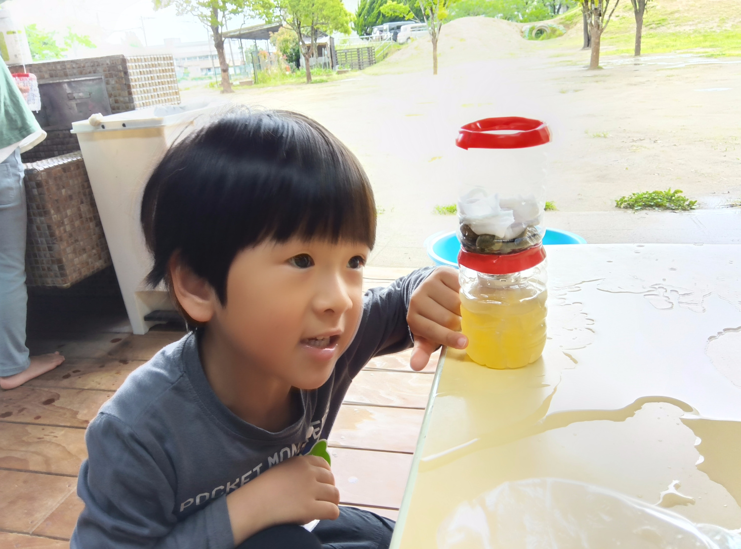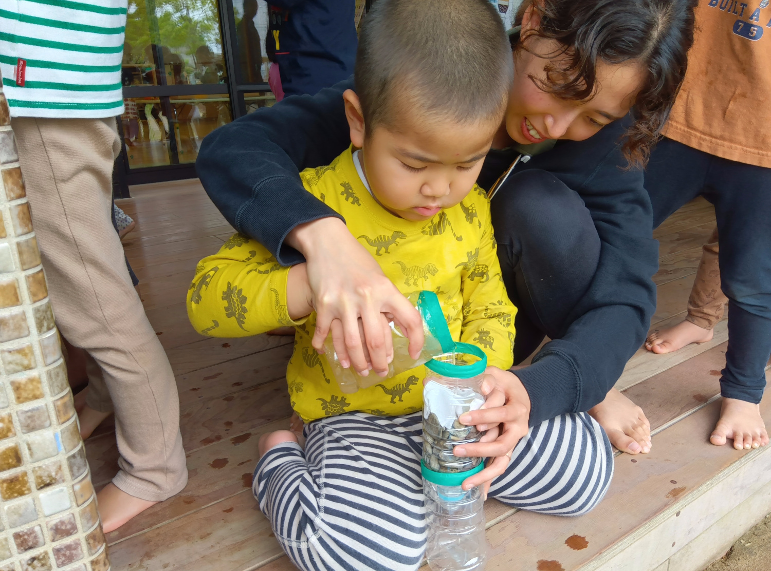 いつも園庭にある身近な小石、ガーゼや脱脂綿を順番通りにペットボトルに詰めていくと、簡易的なろ過装置の出来上がりです。順番を間違えてしまったり、どれくらいの量を入れたらいいのか分からない時には、友だち同士で教えあったり協力したりする姿が見られました。