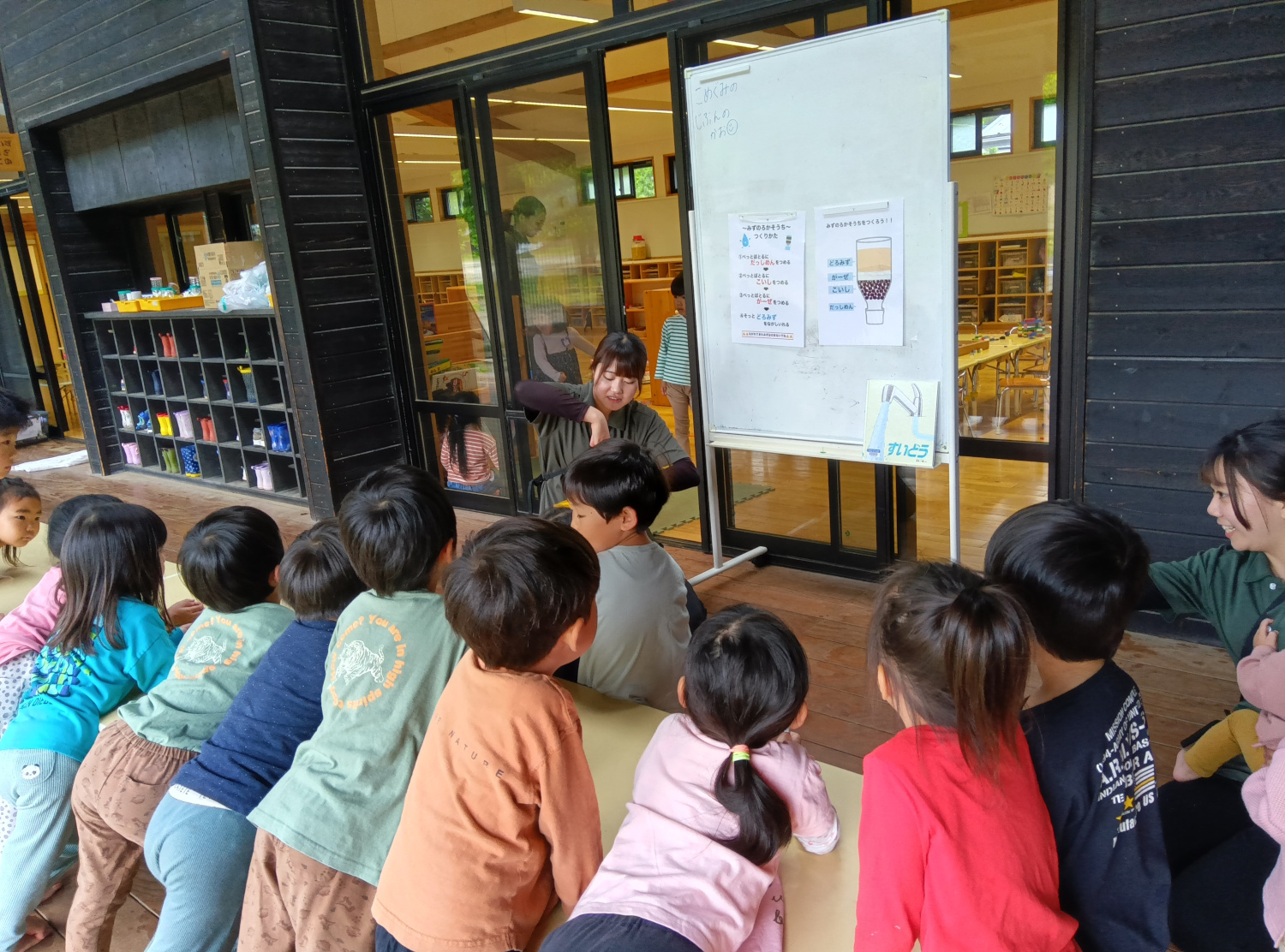 みんなで「きれいな水が作れるのか小さな工場を作って実験してみよう」と語りかけると、子どもたちから「やりたい!」と次々に声が上がりました。