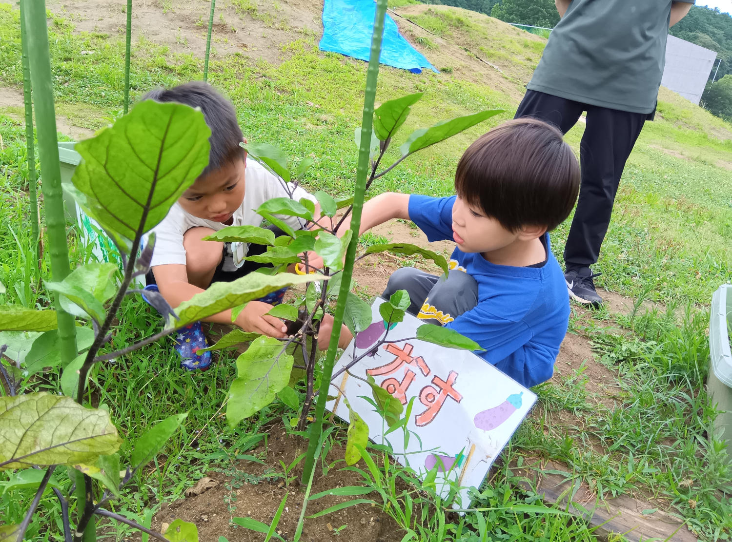 最初に、育てた野菜の収穫を行います。「大きくなった野菜はどれかな。探してみよう!」と言葉を掛けると、しゃがんで一生懸命収穫できそうな野菜を探す子どもたち。「このピーマン大きい!」「このナスも取れそうだよ!」と声を掛け合いながら行っていました。