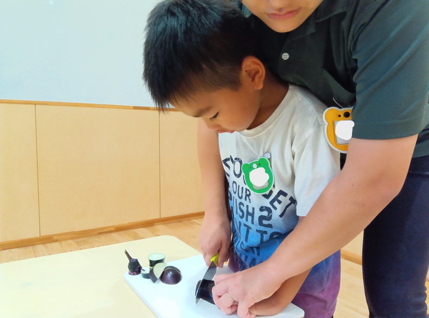 包丁の持ち方や野菜の支え方をおさらいしてから行いました。「包丁を持たない手はどうするのかな?」と子どもたちに質問してみると、「ねこの手!」と答えることができていました。