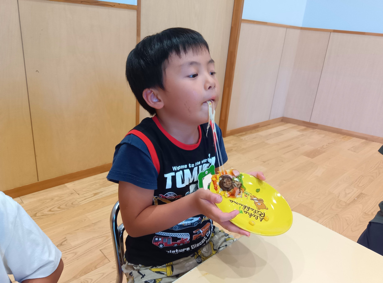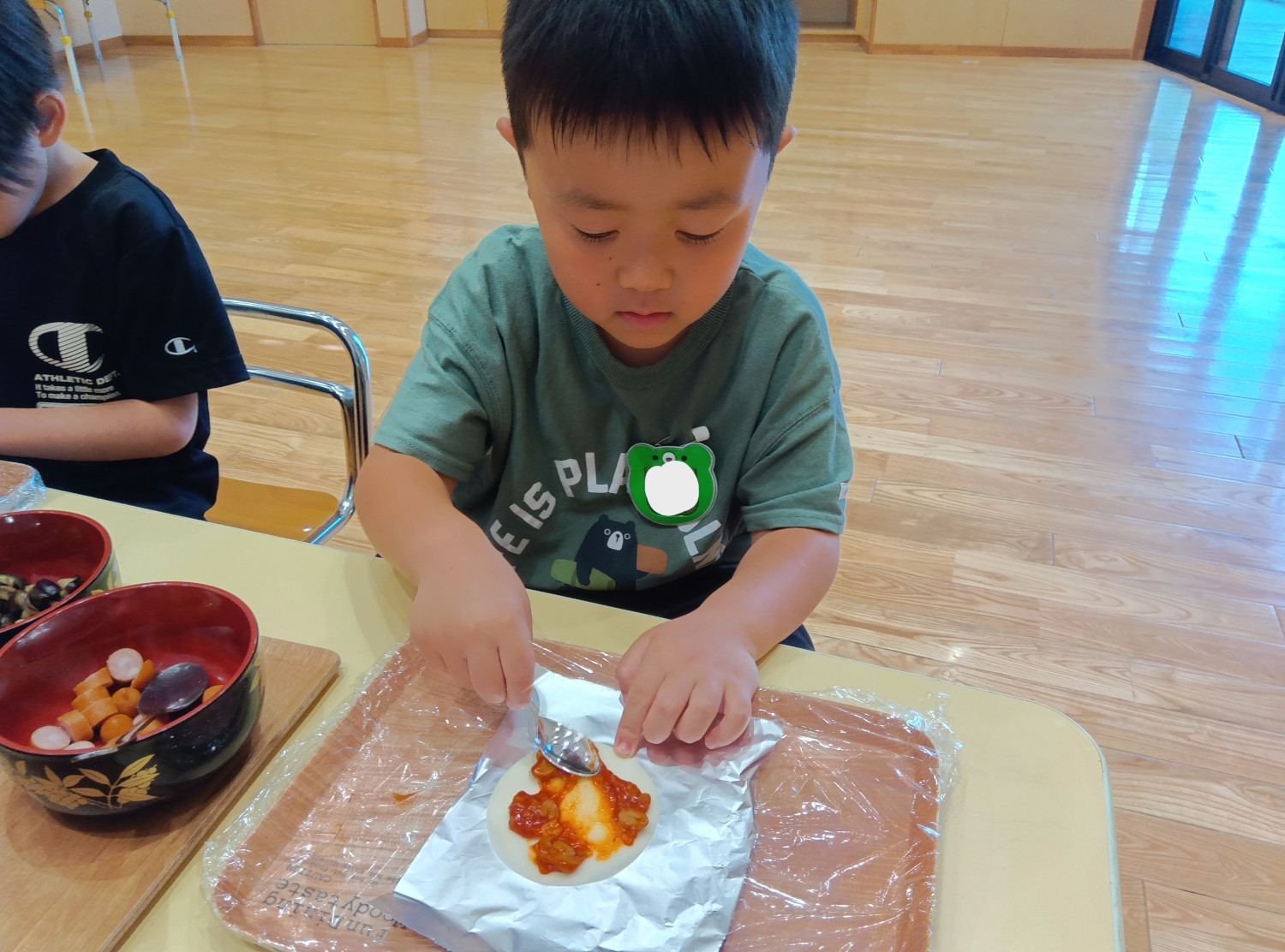 チーズがきれいに伸びていますね。CMみたいです。「トマトおいしい!」「ピーマンおいしい!」など、自分たちで育てた野菜を食べられることが、嬉しい様子の子どもたちでした。野菜からパワーをもらって暑い夏を乗り切ろうと思います。