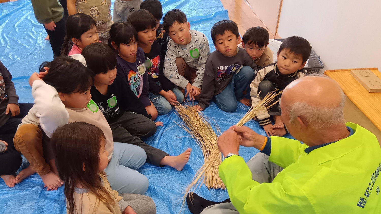 宮下どろんこ保育園、つむぎ 宮下ルームの広い園庭には田んぼがあり、4月に田植えをし、10月に稲刈りを行いました。刈った稲穂は、子どもたちで脱穀、籾摺りを経て、普段子どもたちが目にするお米へと変身しました。その一連の作業の中で出た藁を使用し、しめ縄を作りました。