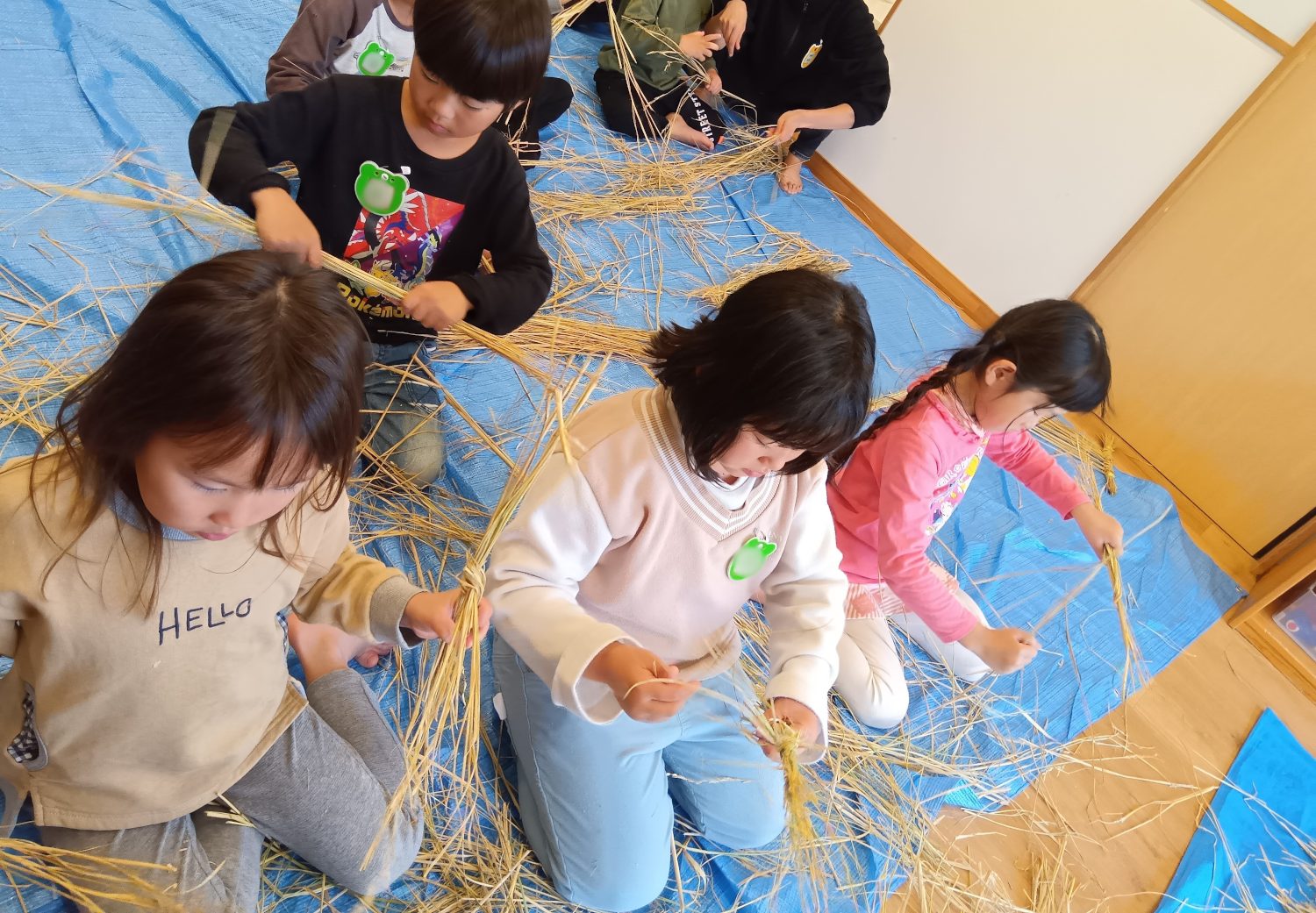 昼夜の寒暖差も小さくなり、冬の訪れを感じる頃となりました。宮下どろんこ保育園、発達支援つむぎ 宮下ルームでは、しめ縄づくりを行いました。