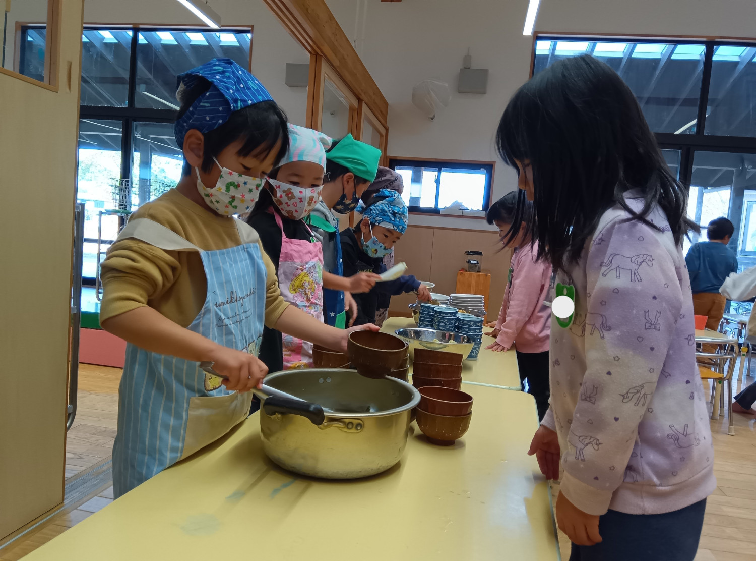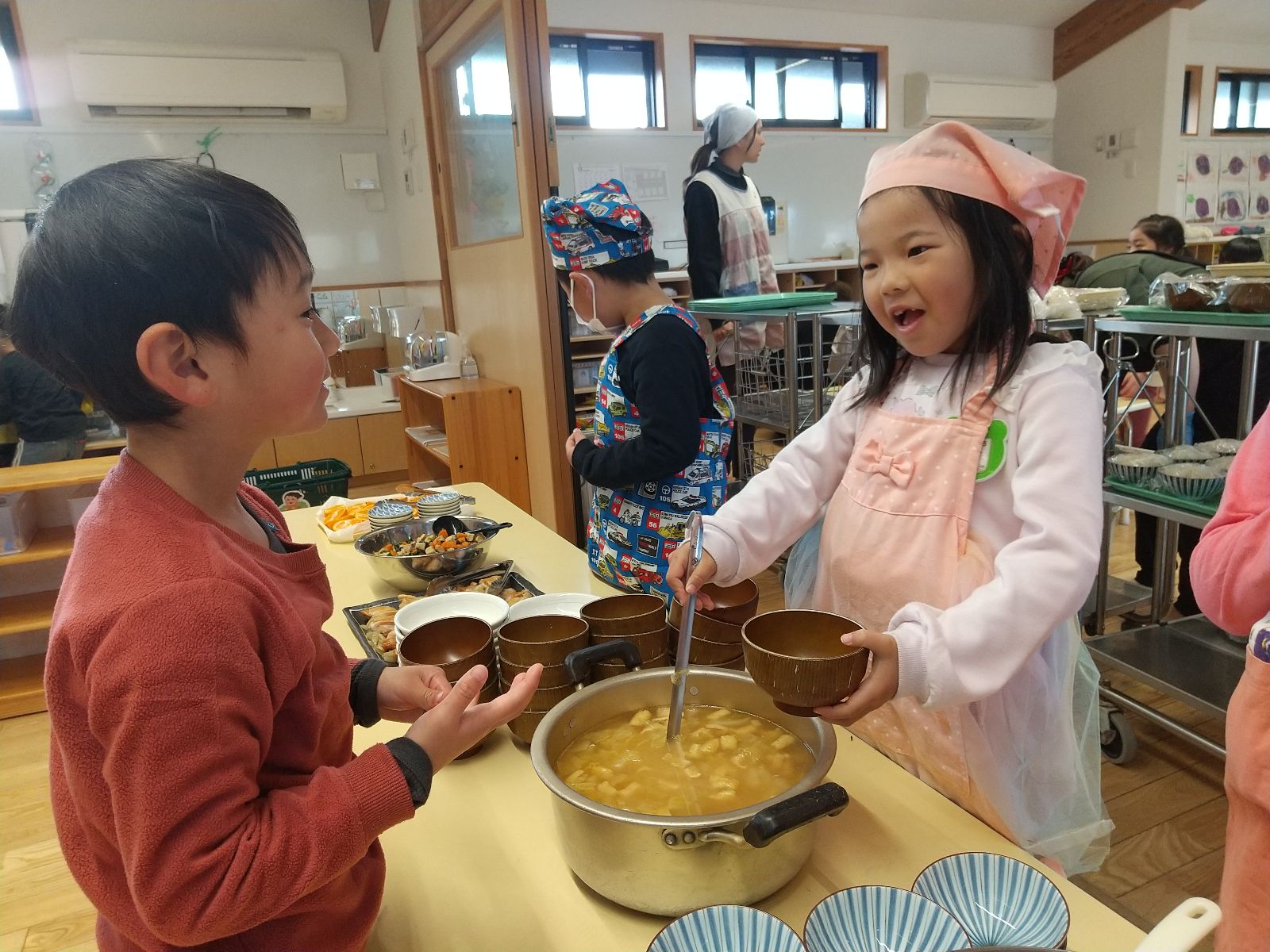 お当番活動も、二巡目になってくると、「どのくらい?」と聞く様子もあり、こぼすことなく配膳できるようになってきました。また、汁ものは汁だけ、和えものは人参だけなどと分けていた子も、「いっぱいちょうだい!」と、張り切って伝えている姿もありました。