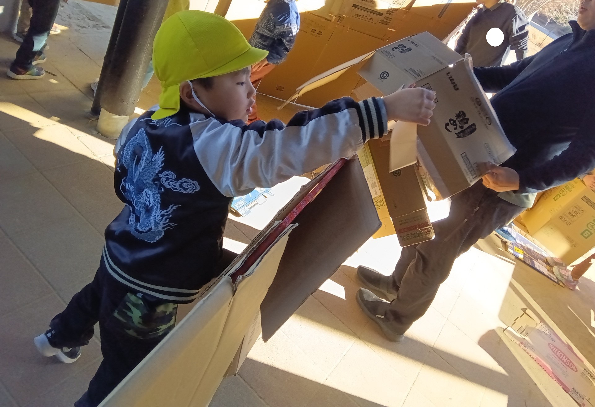 いよいよデイキャンプの当日です。午前中はテント作りを行いました。「キャンプと言えばテント!」とテント作りをしたいという意見が多く上がりました。まず、柱にロープを縛り、その上に段ボールをかけ、ガムテープで段ボール同士を貼り付けていきます。子どもたちは、段ボールを運ぶ役やガムテープを切って友だちに渡す役など、それぞれ自分の役割を意識しながらテント作りに取り組んでいました。「ねえねえ、ここを持って」「あともう少し大きい段ボールを持ってきて」と、みんなで一つのテントを作るために試行錯誤しながら力を合わせて手を動かす姿が印象的でした。テントの中では「ベッド」や「キッチン」を段ボールの形を変えながら作ることを楽しむもたちの姿も見られました。それぞれがイメージしたものを主体的に作り上げていく様子も見受けられました。一方、テント作りの裏では、集めた段ボールを使い、段ボール滑りを楽しむ子どもたちもいました。
