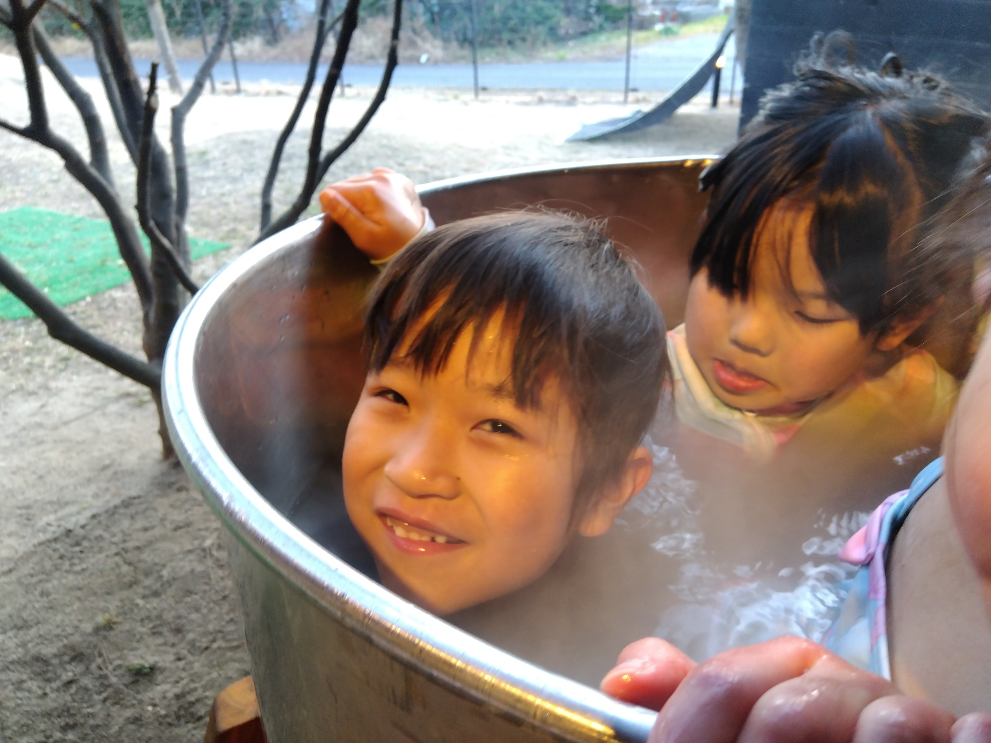 最後には、自分たちがおこした火を使ってドラム缶風呂に入りました。真冬の中で入るドラム缶風呂は、より一層「気持ちいい!」ものとなりました。「先生、あったか~い」と身体を温めながら、自分たちが起こした火の力を直接感じることができました。