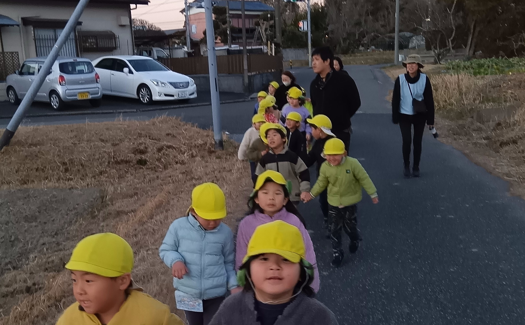 ドラム缶風呂に入った後、お楽しみナイトハイクに出発しました。「肝試しがしたい」という意見も出たので、散歩先は近くの神社に決まりました。懐中電灯を持ちながら歩き進めます。普段日中の散歩の中で歩いている道も、暗い中を歩くといつもとは違う道に見えました。普段とは違う特別感を感じながら歩き進む子どもたちの笑顔が印象的でした。神社に入ると、「怖い」「なんかいる!」といった様々な声が聞こえてきました。子どもたちが見る夜の神社は特別なものだったと思います。帰り道では、子どもたちから「ああ~ 楽しかった!またやりたい!」と充実感にあふれる言葉がたくさん聞こえていました。