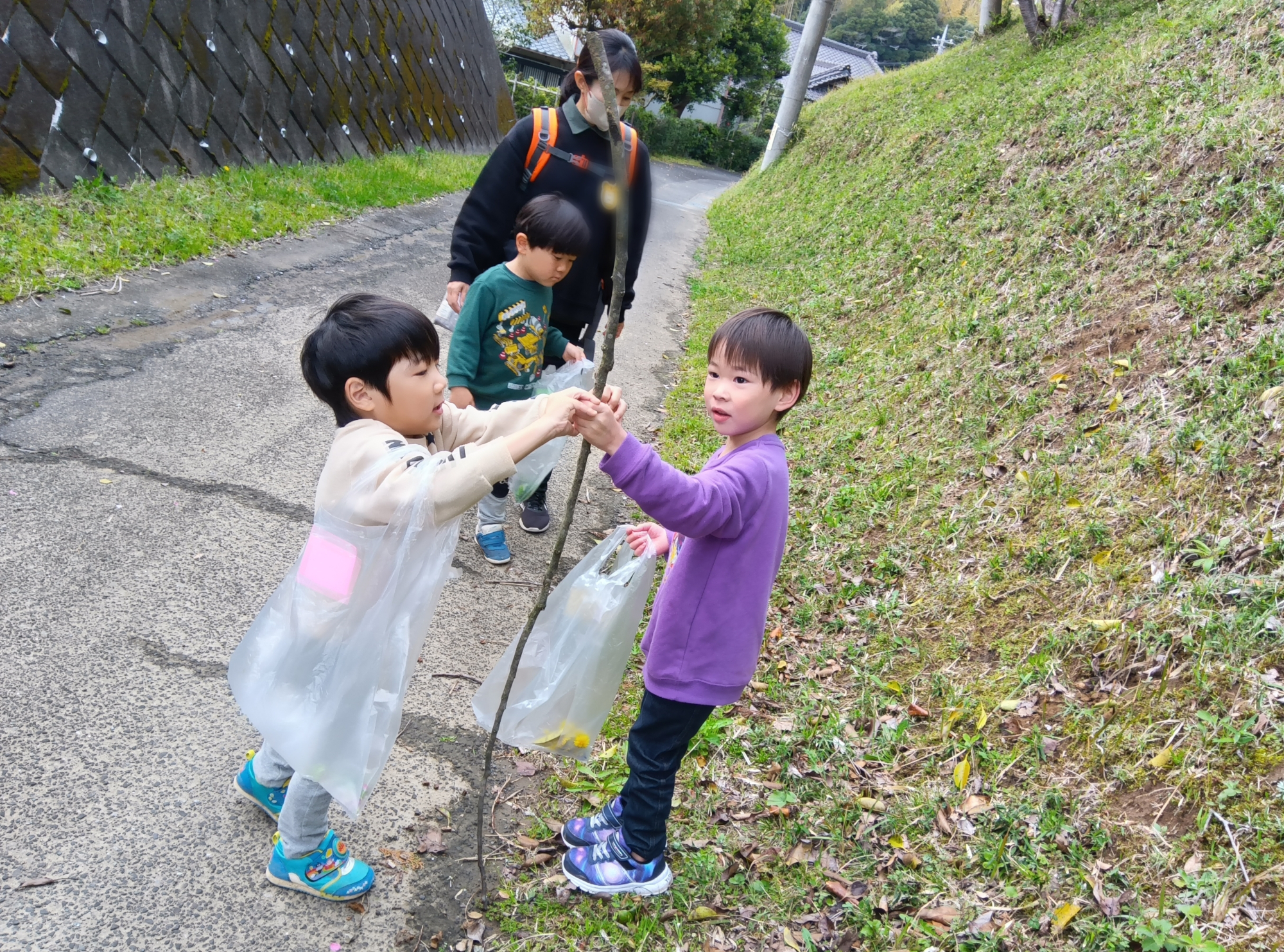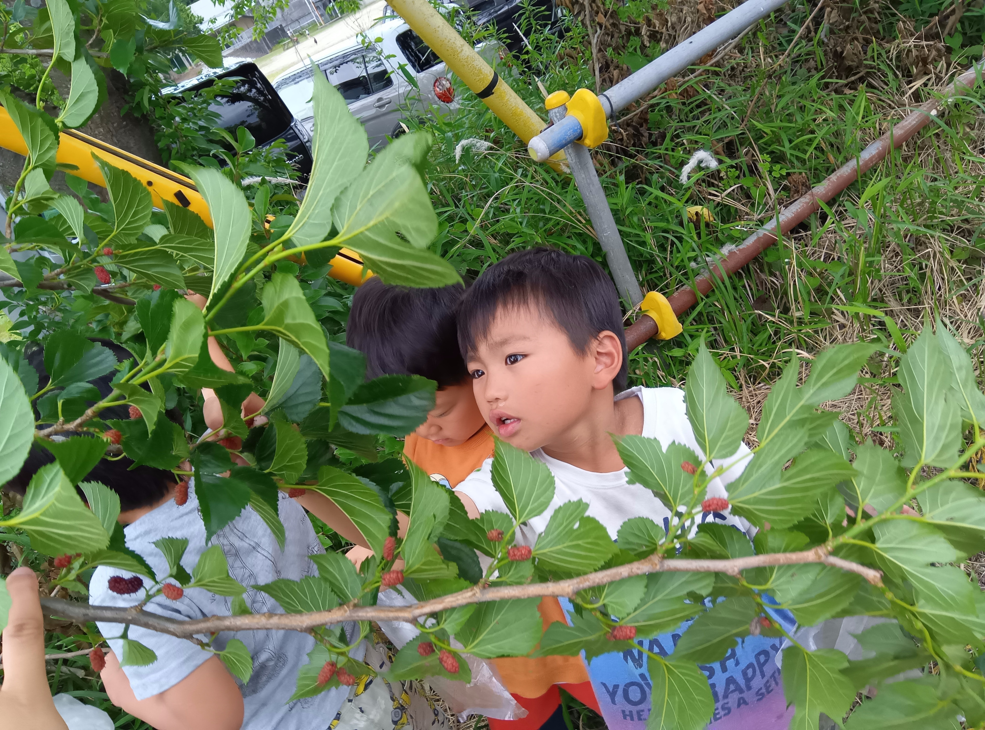 散歩へ出発し、歩きながら自分の袋に葉っぱや枝、花びらなどの自然物をたくさん入れていきます。「こっち来て!桑の実、たくさんあるよ」と木の上を指差しながら、友だちに自分が発見したことを伝えます。どれくらい手を伸ばせば、枝まで手が届くのか、自分の身体の動かし方を意識しながら、一生懸命身体を動かします。「ねえねえ、袋持ってくれる?」「この枝、誰か押さえてほしい」と友だちと協力しながら、素材を集めていきます。