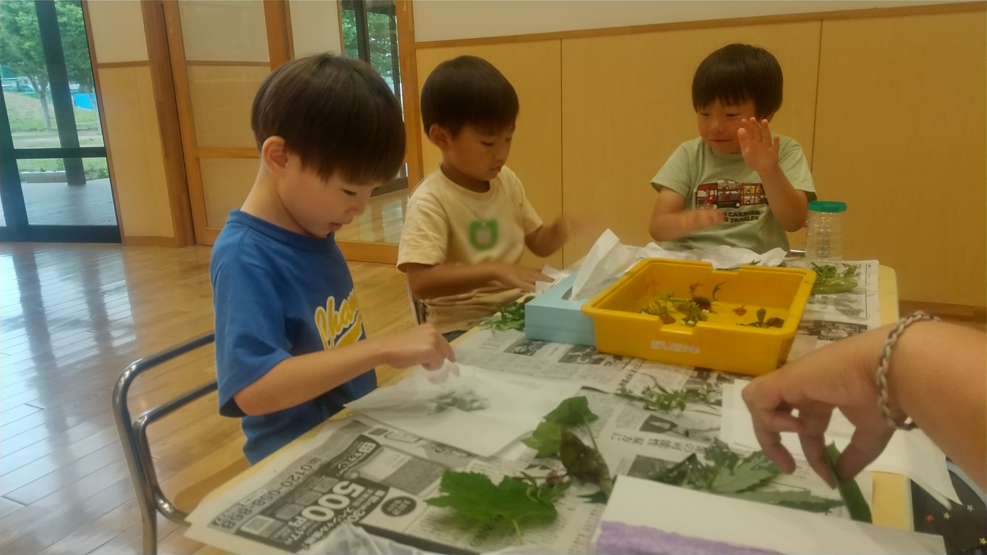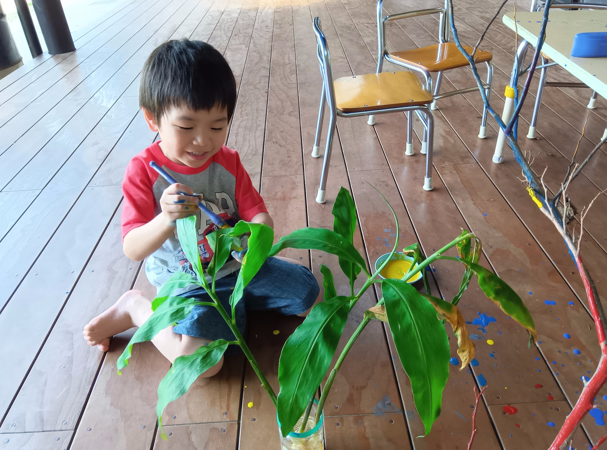 「枝に絵の具で色を塗る時に、上から塗る人、下から塗る人で進めていったら、枝の途中で絵の具が混ざっておもしろい」「葉っぱの中でも絵の具が塗りやすい葉っぱとそうではない葉っぱがあるのはなぜだろう?」手を動かしながら、たくさんの「不思議!」に出会えたようです。