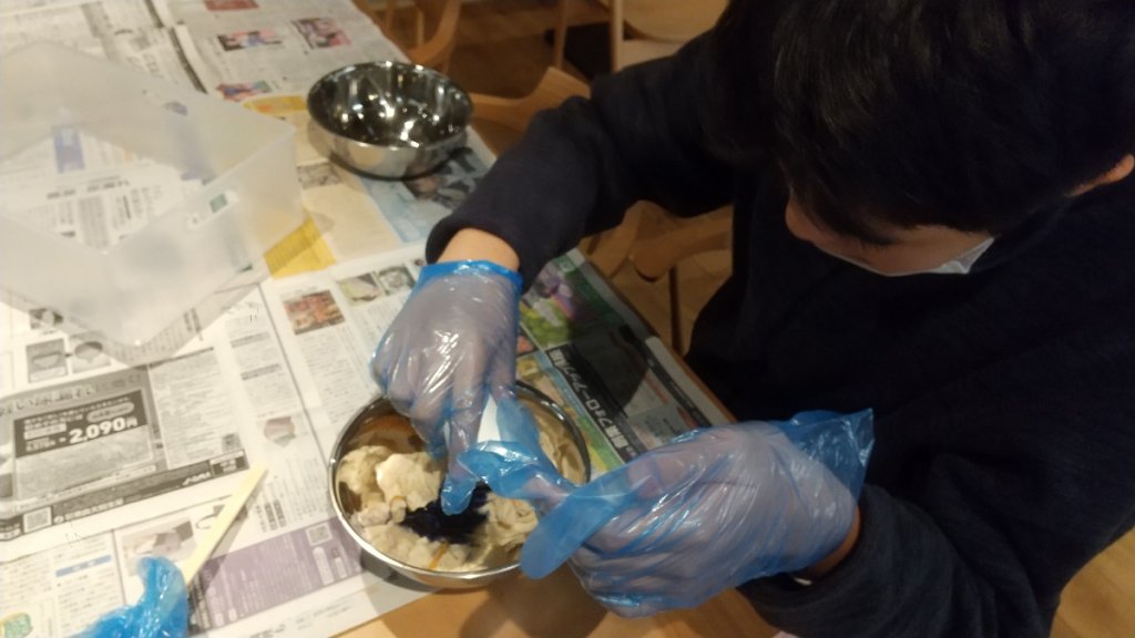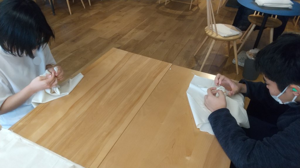 スタッフと一緒に染めながら、布を縛る方法によって完成する柄が変わることに気づき、なぜ模様が変わるのかとスタッフに質問したり、美術が得意な部分を活かし、色を複数選択し柄の大きさを考えながら模様を工夫する姿が見られました。単色よりも2色など複数色で染めるのが一番きれいなデザインになることもわかりました。