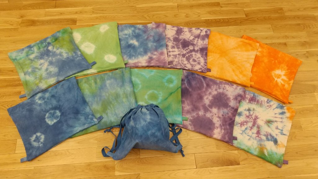 こうして様々な色や模様に染め上げた布を使い、子どもたちが散歩に行く際にボールや砂場道具を運ぶ小さなナップザックに仕上げ、サプライズのプレゼントにする予定です。