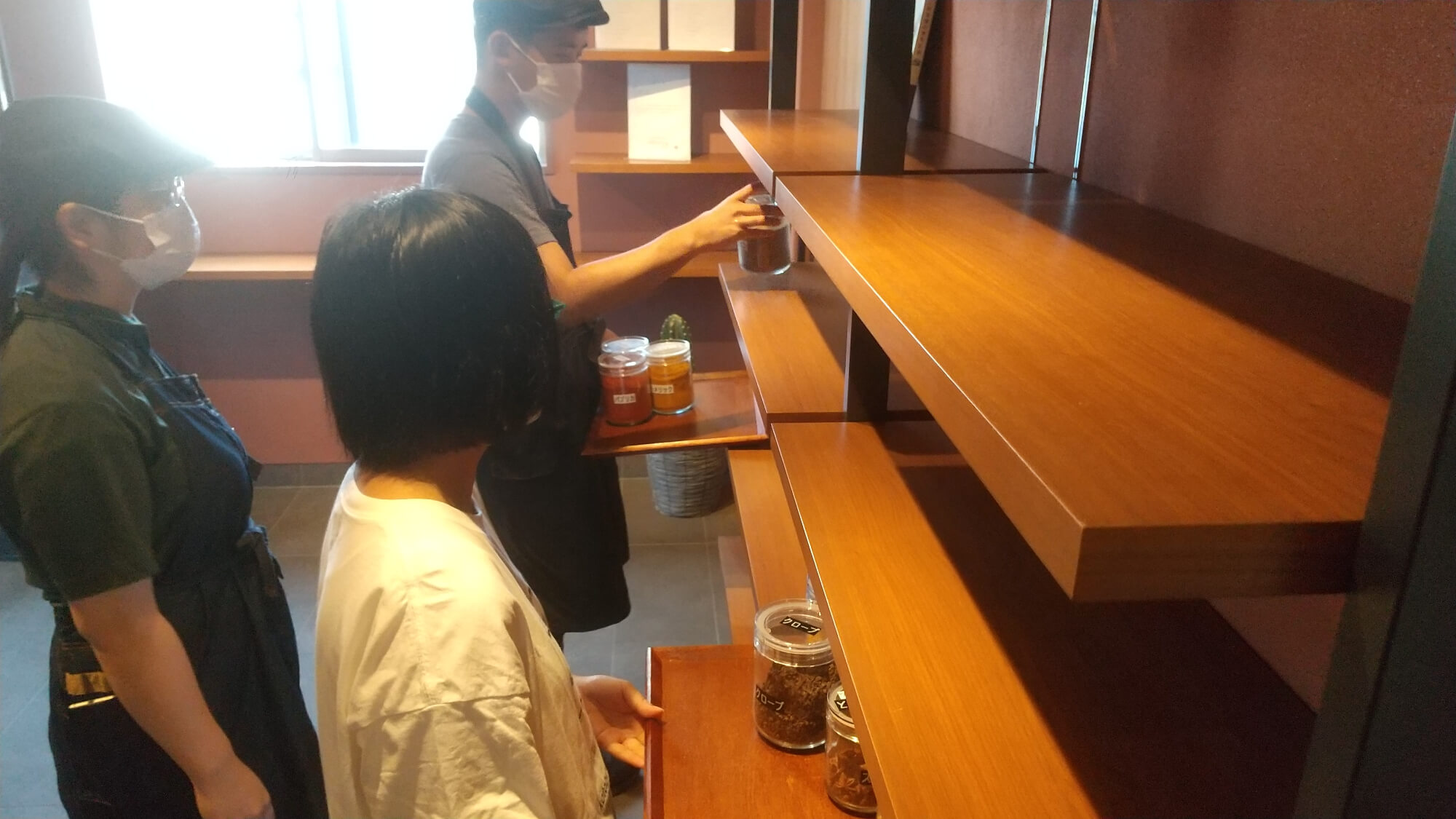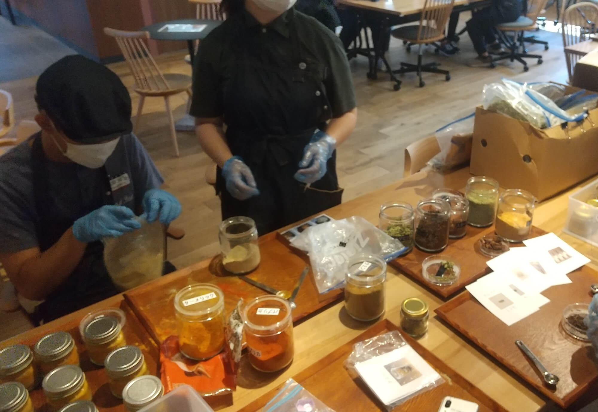 夏休みに入り、ようやく就労支援の方々との交流を実現することができました。利用者さんと一緒にカレー店「TSUMUGI CAFE」のためのスパイス作り・シール貼り・在庫管理・戸外活動など、その日におこなう仕事を体験させていただきました。