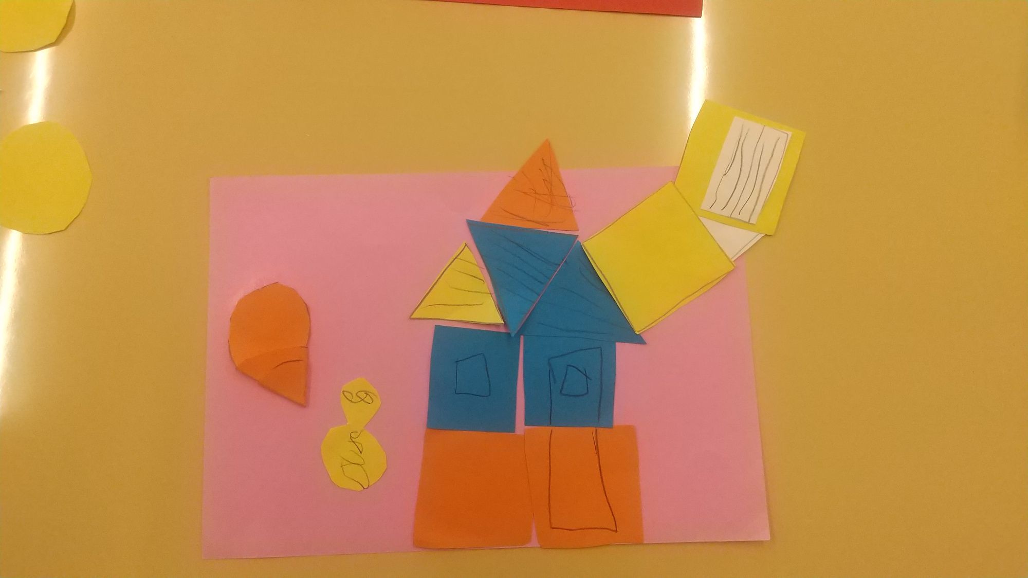 図形を使った創作遊びでは、はさみを使用し大小さまざまな丸や三角、四角を作り、そこから何ができるかを一緒に考えてみました。初めに丸と三角でアイスクリームと簡単な形をつくると、次は「家をつくってみよう」と四角と三角で家を作り始めました。最後には煙突をつけ接続部分に小さい三角をつけるこだわりまで表現でき、立派な家を完成させていました。