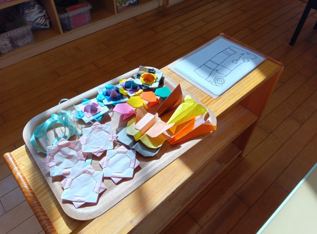 最後に、卒園児が在園児のために感謝を込めて製作した折り紙の駒や飛行機などの手作りおもちゃと塗り絵をプレゼント。