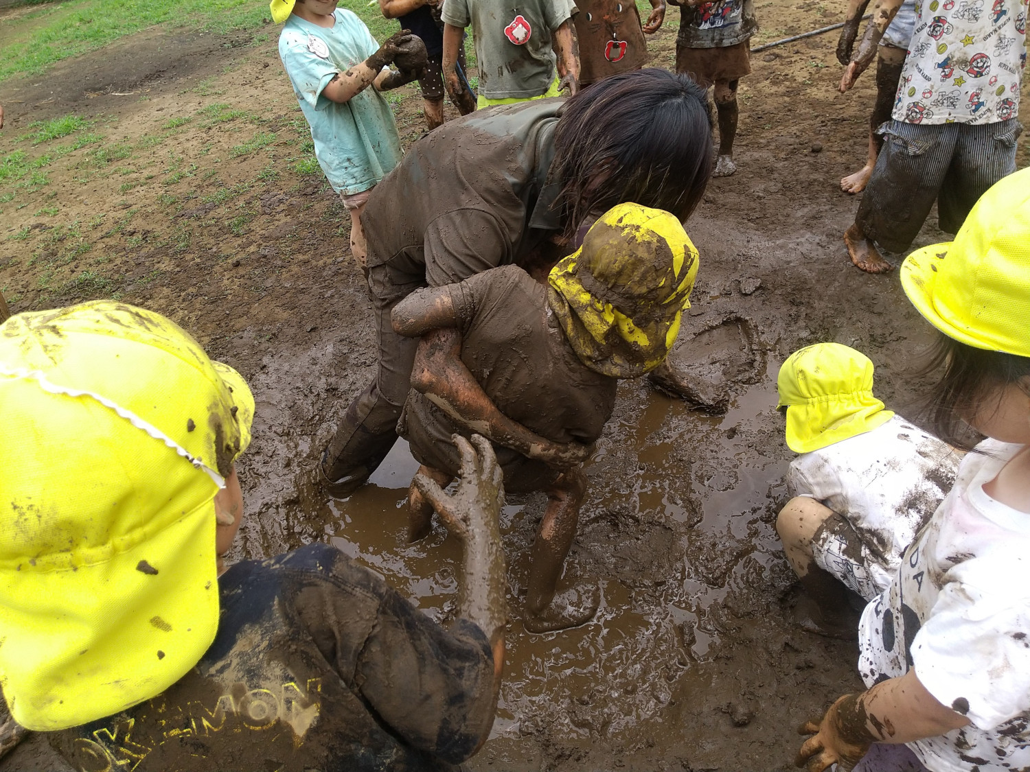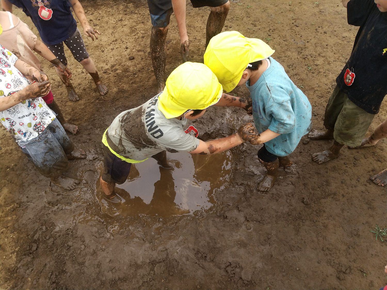 最初は泥の上で裸足になることに抵抗のある子もいましたが、楽しんでいる周りの友だちを見て「やってみようかな」という気持ちが自然と湧きあがり徐々に一歩踏み出す様子が見られました。一度踏み出してしまえば、積極的になっていき最終的には全身どろだらけになって楽しむことができていました。