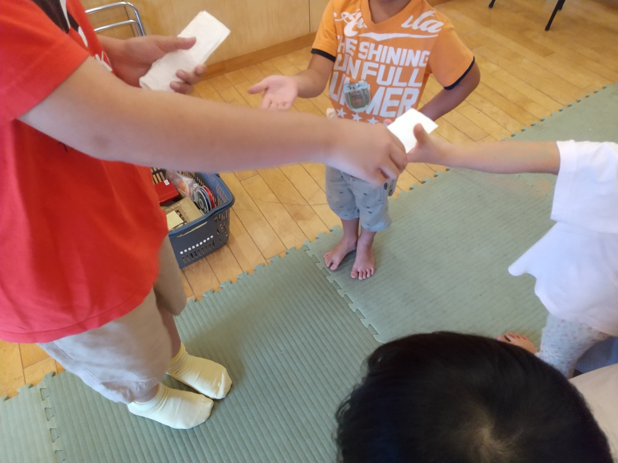 普段小さな子どもと関わりと持ったことがなく緊張した面持ちの利用者もいれば、大きな声で「紙が欲しい人は言ってください、〇〇ちゃんの出来たよ」と積極的に園児に声をかける利用者もいました。緊張していた利用者も時間がたつにつれて、園児と会話を交わしながら楽しんでいる様子も伺えました。