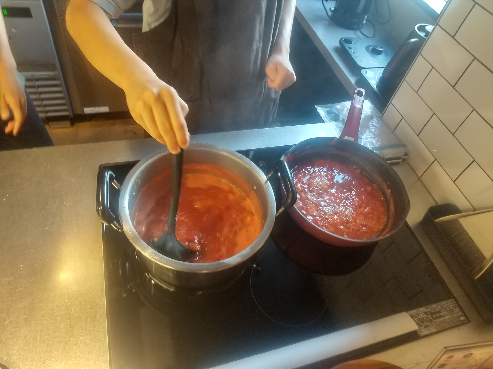 まずはケチャップ作りです。水やり、雑草抜きをして育てた真っ赤なトマトを潰し、酢・砂糖・塩と一緒に煮込みます。「ジュースみたい、失敗かな」と不安そうに呟くA君でしたがこげないように繰り返し混ぜて加熱し、水分が飛んで状態が変化してくると安堵の表情を浮かべていました。
