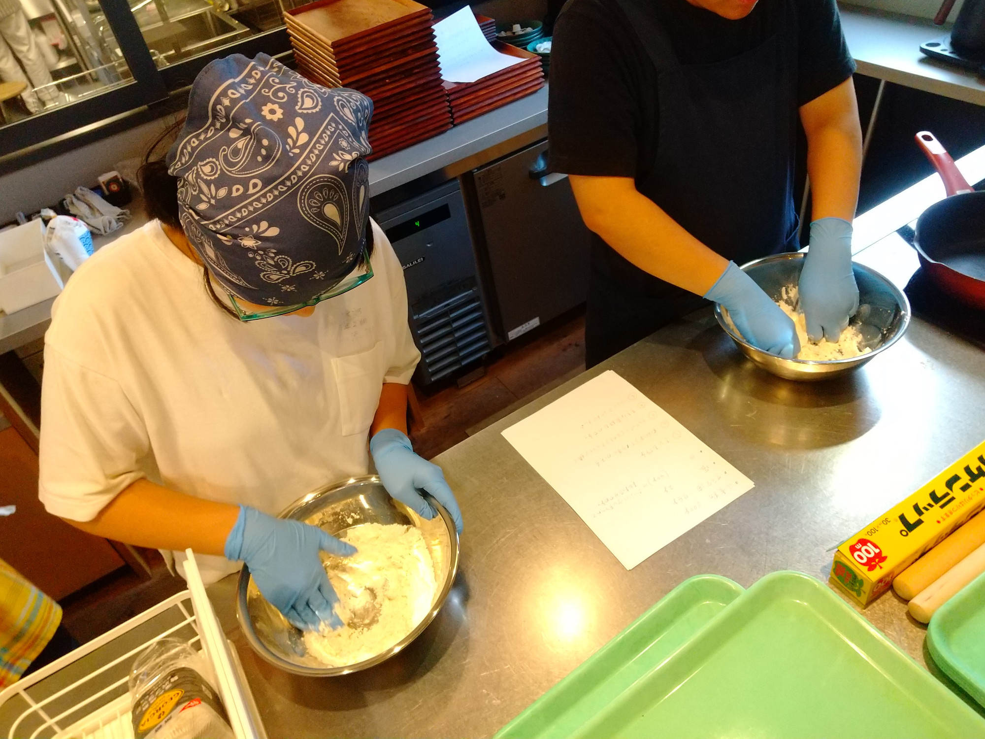 小麦粉と塩、水を少しずつ加え生地を作ります。「もう少し薄く伸ばして」「体重かけてこねるといいよ」と言葉をかけ、教えてあげる姿が利用者同士で見られました。