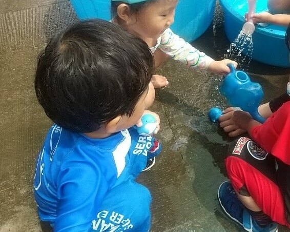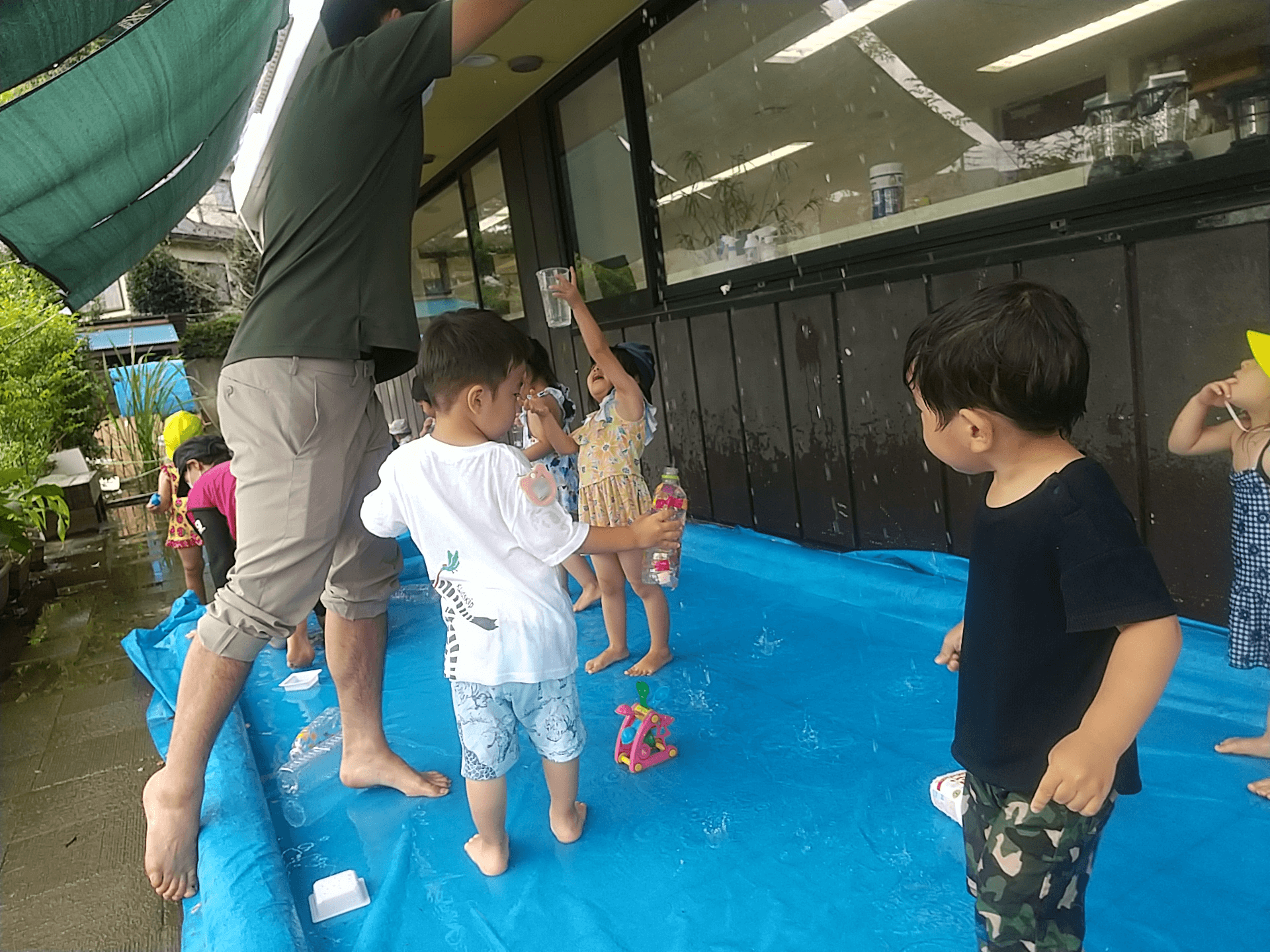 子どもたちが好きな水遊びを通して、新しい感覚に触れたり、友達の遊びを観察し真似したり、一緒に遊んだりと様々な様子が見られました。引き続き、子どもたちの「やりたい」という気持ちを大切にし、友達と様々な遊びを経験できる環境設定をしていきたいと思います。