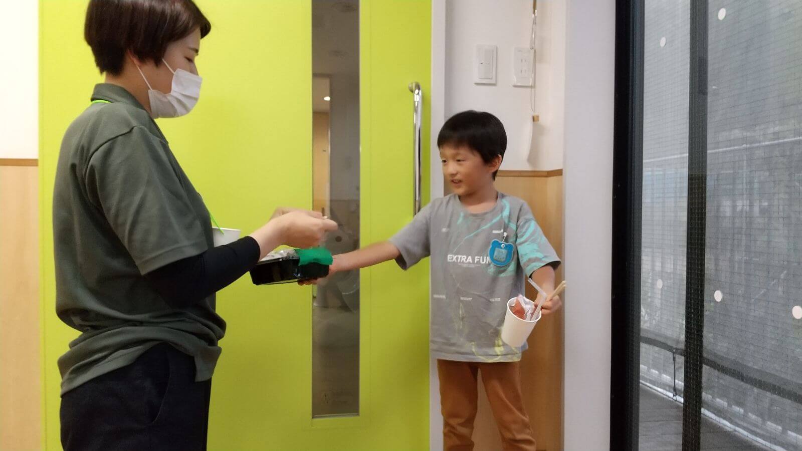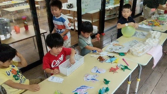 いつもと園の雰囲気が異なる様子に驚く子もいましたが、保育園の子どもたちが「いらっしゃいませ」と威勢よく呼び込むと、ゆっくり近づいていき、商品を選んで買っていました。恐竜好きな子は、恐竜をたくさん買うなど思い思いに楽しむ様子が見られました。お祭りごっこの日から子どもたちの中では買い物ごっこがブームとなり、自分で商品やお金を作り、「いらっしゃいませ」と友だちを誘い、「これください」「どうぞ」と言葉でやりとりしながら遊ぶことが増えました。友だちが買い物ごっこで遊ぶ様子を見て、興味を持ち、買い物ごっこで遊ぶ子がどんどん増えていき、初めは自分から参加しなかった子も少しずつ友だちの遊びに参加してやりとりが広がっていきました。