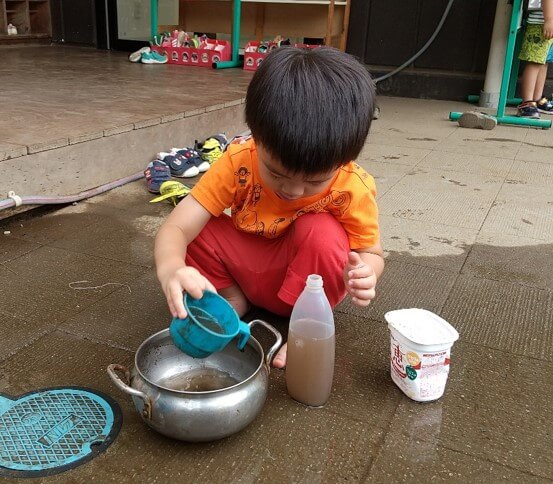 水を使って遊ぶ中で水を手や足で触り、「冷たい」「温かい」という温度の違いに気づいたり、水の流れを見て太陽の光に反射した動きの違いに気づいたりと様々な発見がありました。また、水の流れを見たり、水の移し替えをしたりと子どもが好きな遊びを繰り返し行うことで集中力が高まっていきます。好きな遊び、興味を持った遊びから友だちが遊んでいる道具や遊び方に興味が移り、友だちの真似をしながら遊びが発展していきました。