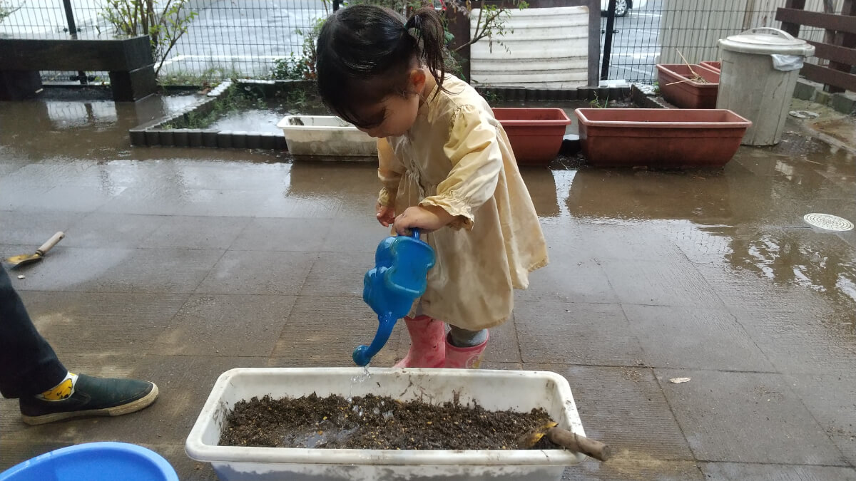 種まきでは重たい土を職員と一緒に持つと「重たいね」と自然と言葉にしており、何気ない動作の中で「重たい」という感覚がわかり、言葉にして表現していました。種まきではとても小さい種を一粒ずつ蒔く子、手のひらに乗せてもらったら全部一緒に蒔く子がいました。最後にじょうろで水をあげると「いつになったらできるな?」と完成を心待ちにしていました。