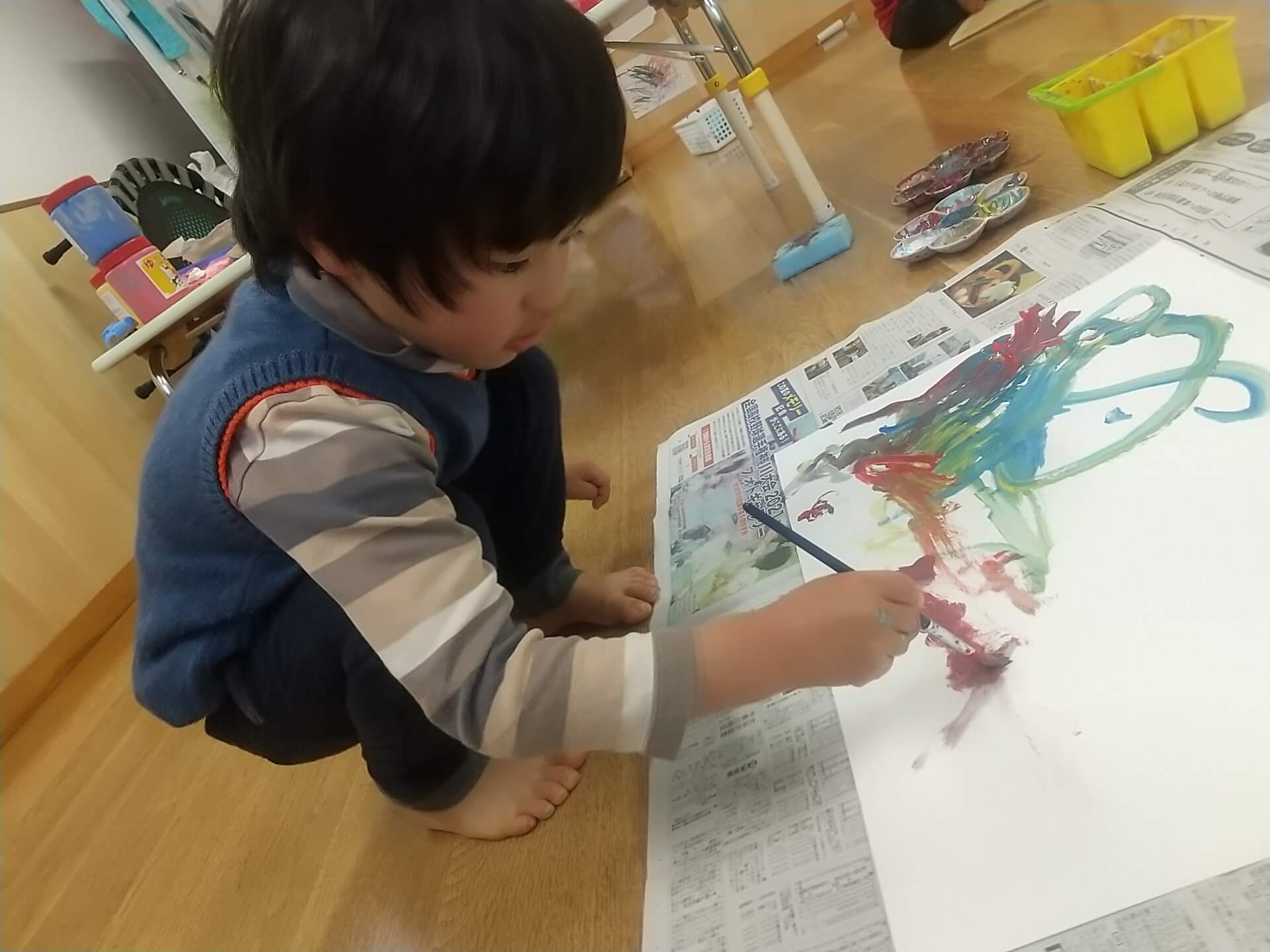 絵の具遊びは、様々な色を使うことで色彩感覚や色の混ざり方をイメージする想像力、筆を持つときの力の入れ具合によって手先の刺激につながります。好きなことに取り組むときの表情は真剣です。
