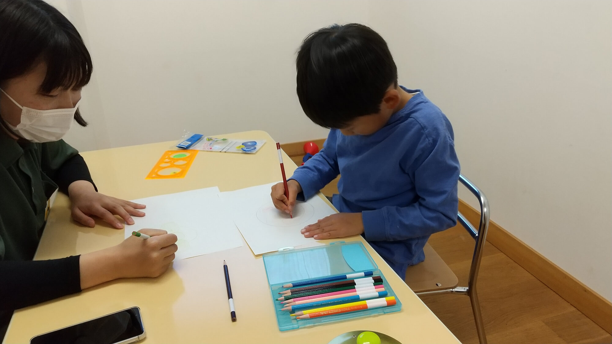 また、職員と一対一で過ごす中で、「こんなことがあったよ 」「これは〇〇を描いているんだ」と話します。落ち着いた雰囲気の中で、言葉で相手に伝える力、相手の質問の意味をくみ取る力等が身についていきます。