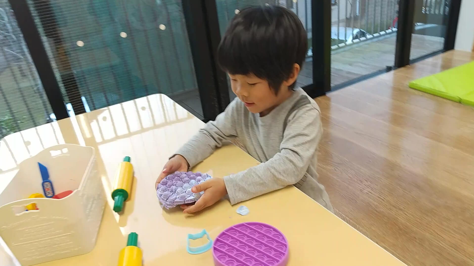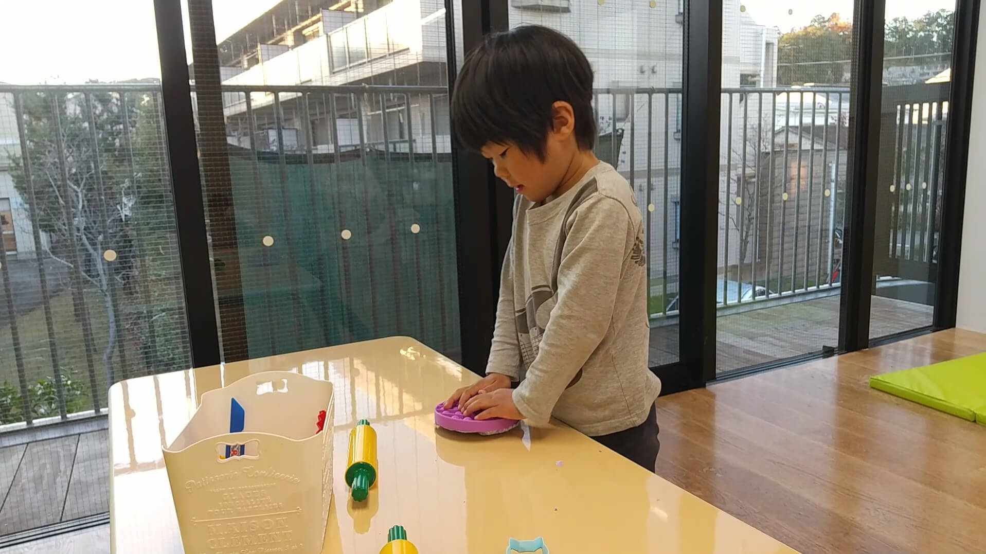 1つの遊びで完結するのではなく様々な素材を用いて遊びを広げていく姿も見られます。紙粘土では、素材を組み合わせ、色々な形を作り出す創造力や、「こんな形ができるんだ」といった気付きが生まれます。