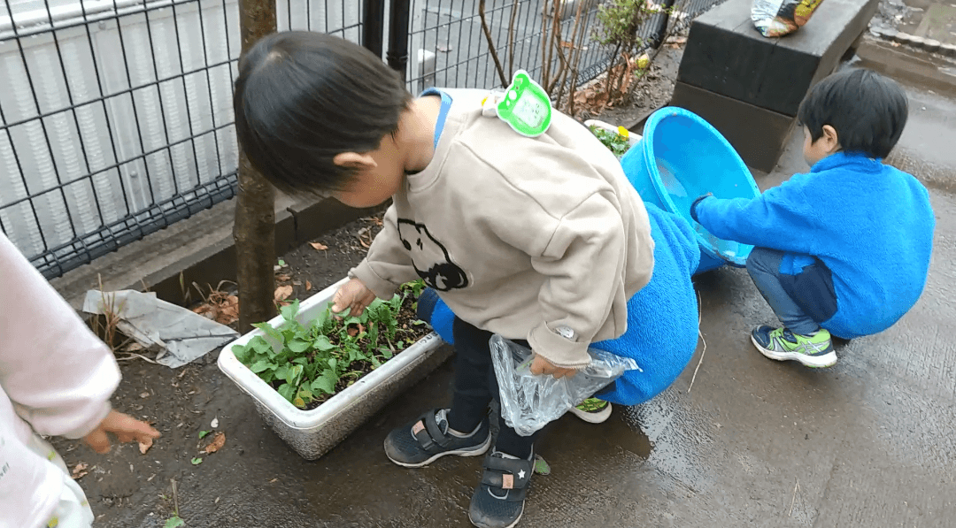 最初は、葉を持って引っ張るため、葉がちぎれてしまい、収穫できない子どもが多くみられました。しかし、友だちや大人が取り組む様子をじっと見ることで、真似をして葉を根元から持ち引っ張り、収穫することができました。自分の体を安定させながら手に力を入れて引っ張るといった体の使い方の練習や、他者の動きを観察して自分の体で真似をする練習につながっています。
