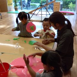 つむぎ 新羽ルームは新羽どろんこ保育園に併設されており、保育園児と一緒に生活をしています。午前中の活動(マンスリー)は9時から13時頃までの活動です。主に散歩や園庭遊びなどの戸外活動をし、昼食までみんなと一緒に過ごします。畑での野菜作りなどの食育活動や、遠足などの行事にも参加します。周辺には、新羽駅や丘陵公園、緑道、太尾南公園やみはらしの丘公園など様々な公園があり、とても自然が豊かな場所です。