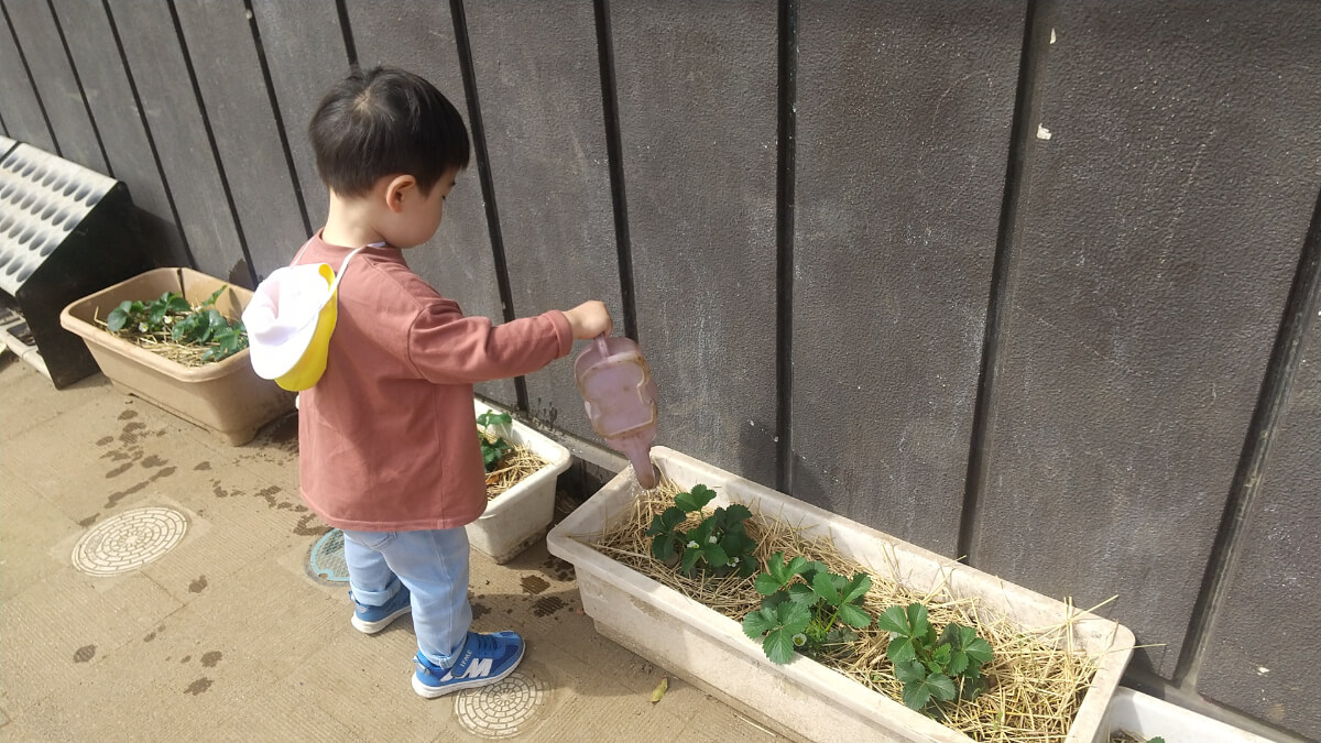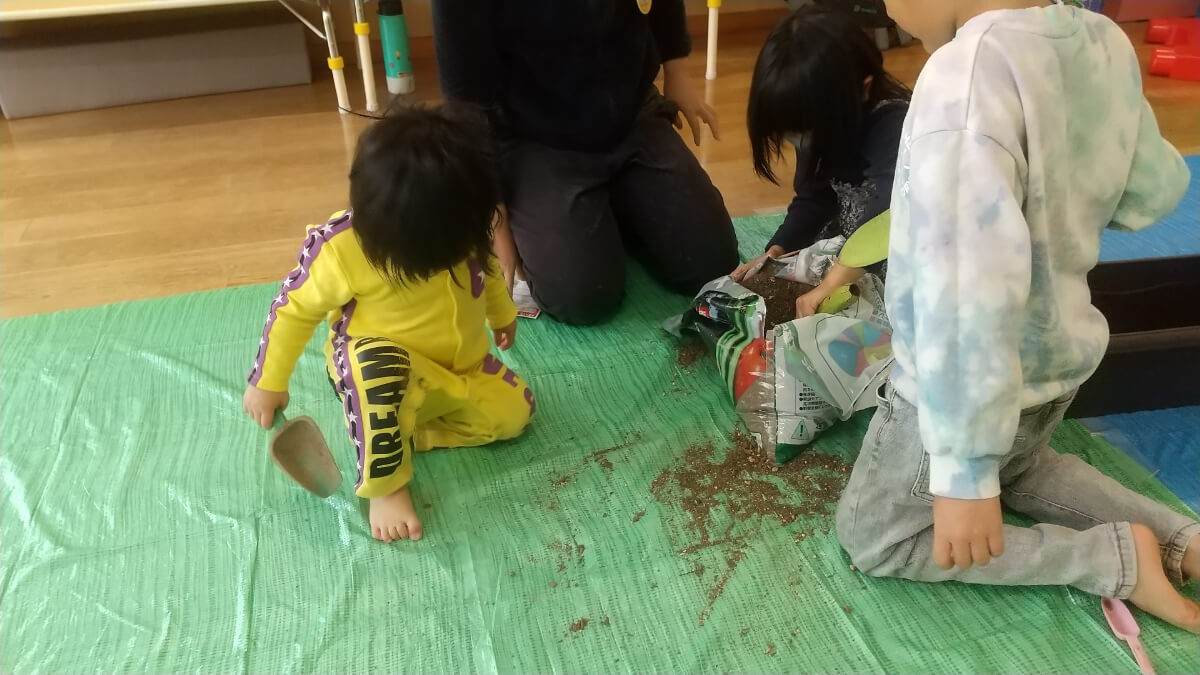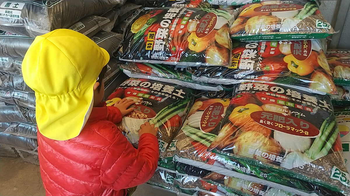 また、去年も野菜栽培に取り組んだ子は何を植えたいか自分で決め、土を買いに行くところから始めました。去年は流れがわからずに大人に聞くことが多い様子でしたが、今年は自分の好きなトマトを育てたいと植えるものを率先して決め、「トマトを植えるのは野菜の土だね」と野菜が書いてある土を選んだり、「ここに植えるんだよね」、「次は水をあげよう」などと自分で考えながら取り組んでいました。
