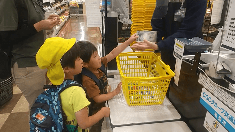 品物を見つけると勢いよくカートを手放して「これ?これ?」と様々な種類の砂糖の中からシロップづくりに使う砂糖を選びました。レジに行き、お会計ではお金を渡してお釣りを受けとり忘れる場面もありましたが、最後は無事にお釣りを受け取り、砂糖を自分たちのリュックに入れていました。普段おままごとで買い物ごっこをしていますが、実際に商品を渡してお金を払い、おつりを受け取って商品を袋に入れる流れを経験することで社会経験や地域の方との交流になり、店員さんと挨拶やお金のやり取りをすることで社会性の向上につながります。