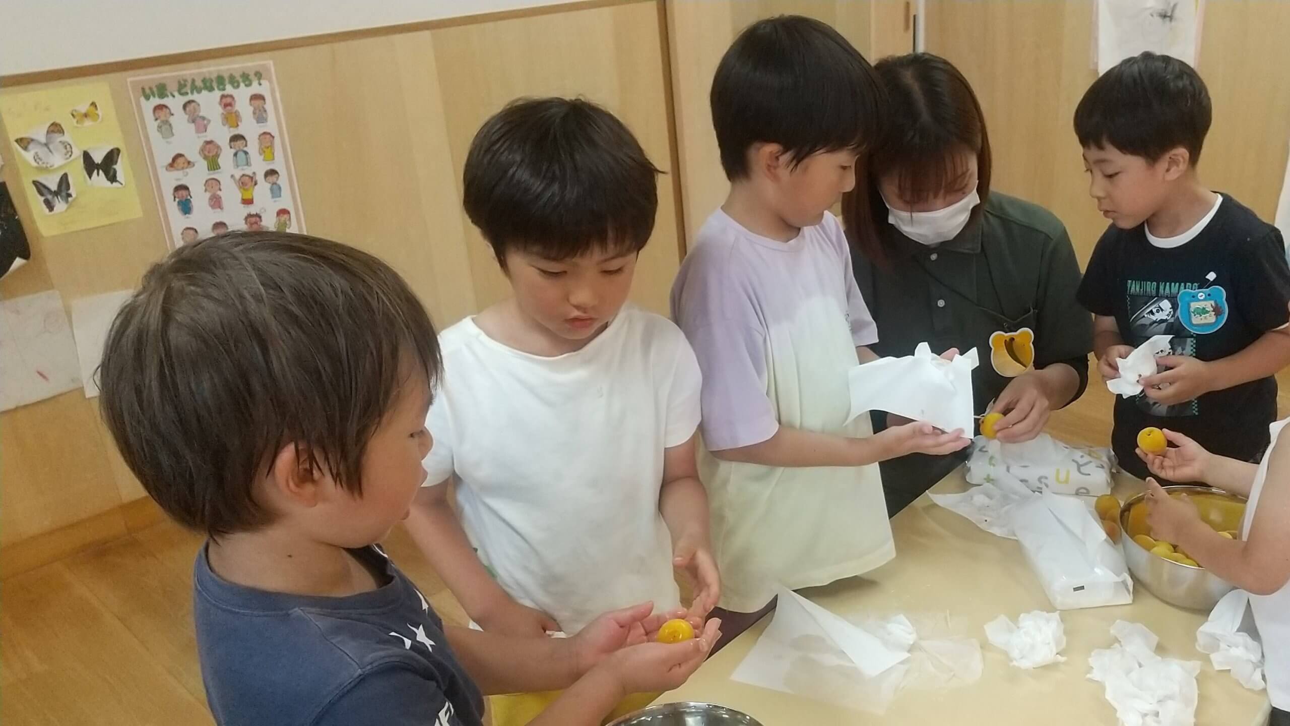 梅シロップ作りを毎年行うことで季節感を感じられるとともに、自分たちで作ったという達成感や完成を待ちわびる期待感、食したときの満足感を味わえる食育につながります。また、昨年と同じ活動をすることで、活動への取り組み方や役割分担の様子で子どもたちの成長が見られました。約1か月後の梅シロップの完成を楽しみに待ちたいと思います。