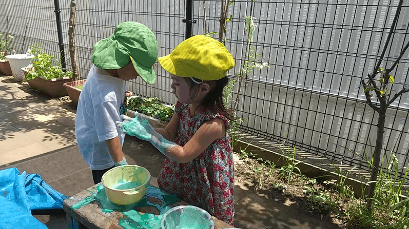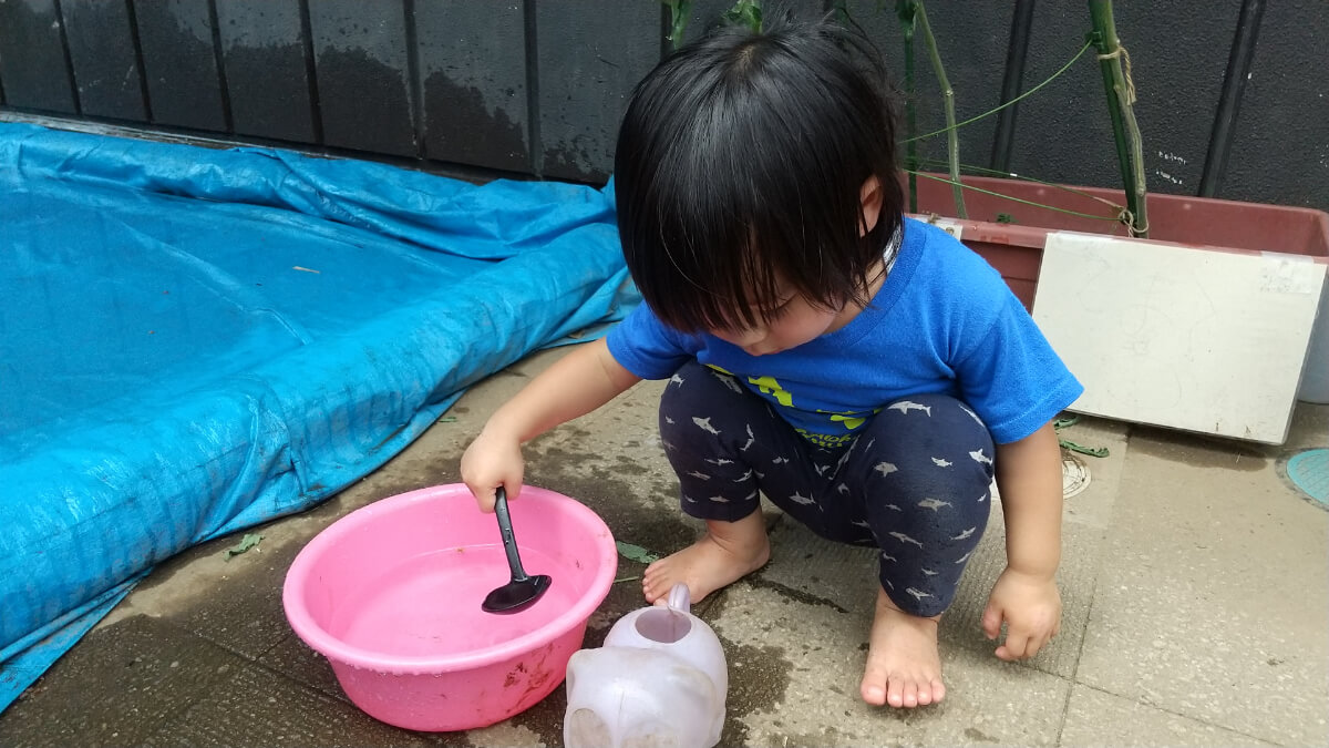 水遊びというと水に触れるイメージが強いですが、水に触れながら他の感触に触れてみたり、植物や生き物を見たりと興味や遊びが広がっていきます。なかには水にあまり興味のない子もいますが、無理に水遊びに誘うことはせず、職員や他児が遊ぶ様子を見ているうちに少しずつ水に興味を持ち、自ら水に近づく、触ってみるという変化が見られました。また、好きな道具やおもちゃを使いながら水遊びをすることで、直接手で触ることが苦手な子も水に親しむことができました。今後も子どもたちが楽しめる水遊びの環境を作るとともに、水遊びでの変化について追っていきたいと思います。