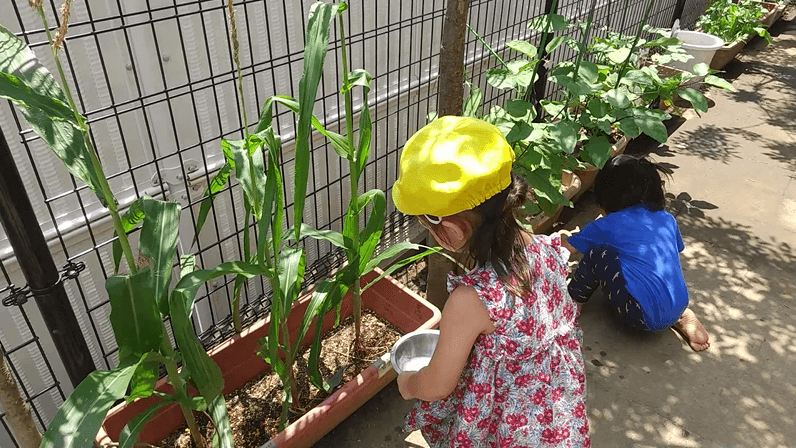 水場の近くには野菜を育てているプランターがあり、水場でくんだ水をトウモロコシにあげる様子も見られました。水をあげるだけでなく葉っぱや土にも触れてみます。土の上を虫が歩いているのも見つけました。