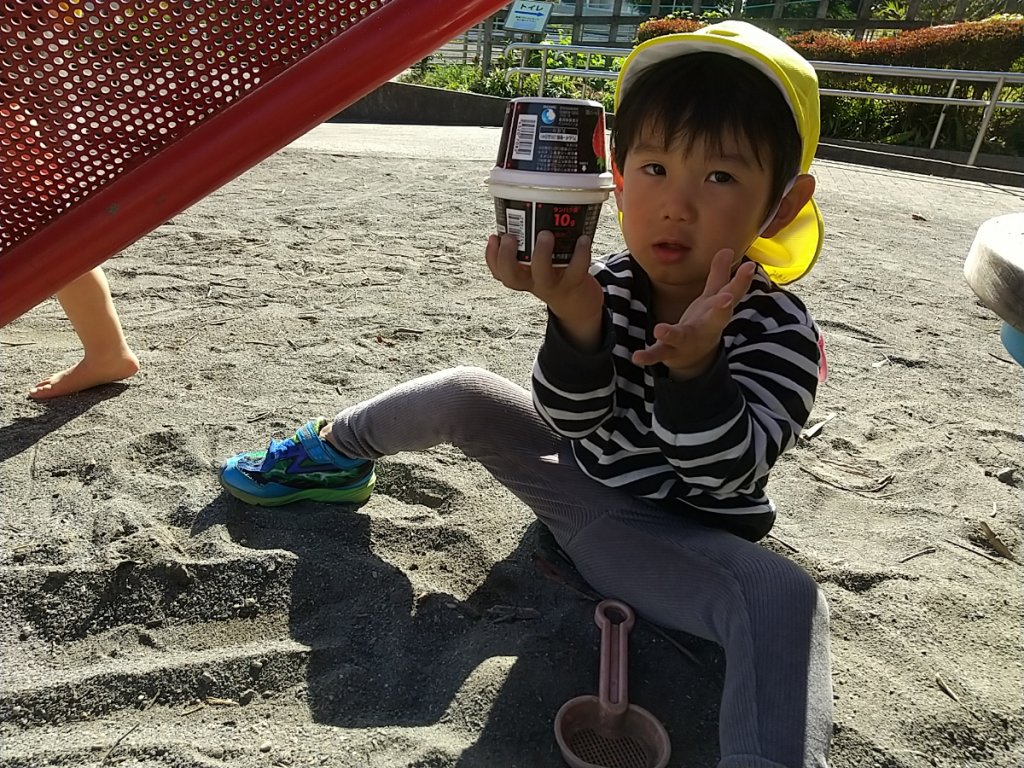 「何の食べ物かな」と聞くと、「ぎゅうどん、いただきます」と言って、食べる真似をしていました。また、スタッフが持っているスコップを使おうと手を伸ばした時に「なに?」と聞くと、「ちょうだい」と言葉で伝える様子が見られました。乳児期の砂場遊びを行う中で、数量や図形、言葉で伝えたい気持ちなどを、子どもたちは自然と学んでいることがよくわかる一コマでした。