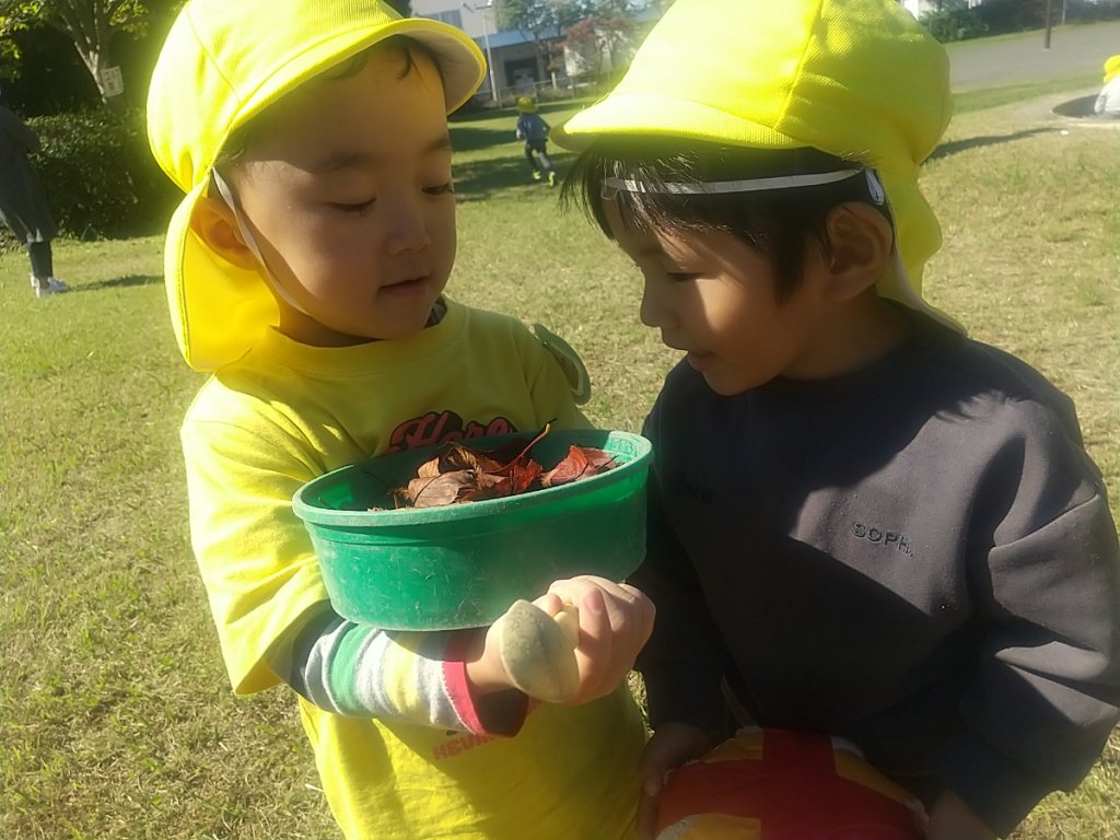幼児グループでの戸外活動の中で、砂場遊びを行った時の様子です。スコップを使い容器に砂を入れ、その上に葉っぱを乗せます。乳児期での砂場遊びで数量や図形を学ぶことで、スコップを使ってこぼさないように砂を入れることや、葉っぱの形を理解して砂をご飯、葉っぱをトッピングというように見立てています。「何作ったの?」と聞くと、「ごはん」と答えます。「なにごはんかな」と聞くと迷っていましたが、隣の子どもが「たまごかけごはん、エビチリ」と言うと、「たまごごはん」と言っていました。大人からだけでなく、子どもからの言葉で言葉が広がっていく様子が見られました。