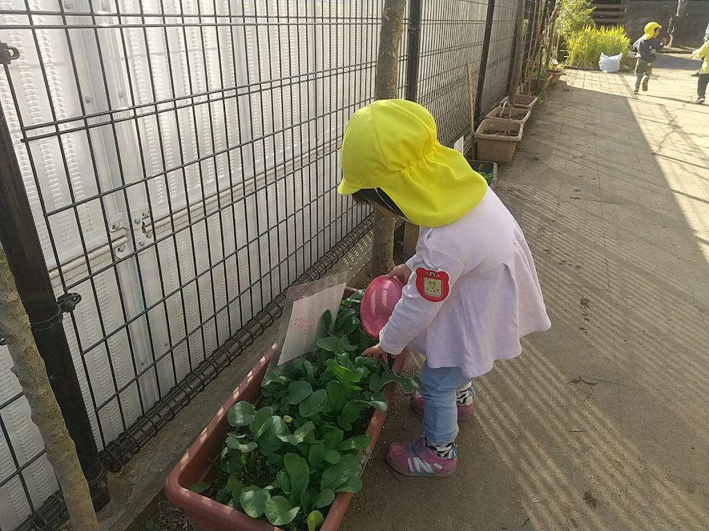 こちらは、園庭で育てている野菜に水やりをしている時の様子です。自分たちで運びやすい容器を探して、水を入れてプランターがある場所まで運びます。事前に、同じ場所に水をあげると野菜がしなびることを伝えましたが、この日は水の量の調節が難しく、一箇所に水をあげていました。成功体験だけでなく、子どもたちは失敗した経験から「次は少なく入れよう」と学んでいくことができます。水やり後、使っていたお鍋に葉っぱを入れて料理を作り始めました。他の子どもが「これ」と新たに葉っぱを持って来ると、「葉っぱもういらないよ」と子ども同士でやり取りする様子が見られました。
