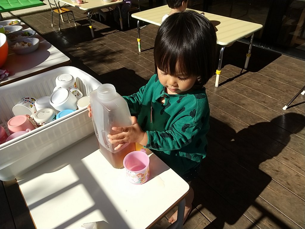 遊びの中だけでなく、普段何気なく生活している中にも数量や図形に触れる機会はたくさんあります。こちらは散歩から帰ってきた際に、お茶を飲もうとしている様子です。コップやお茶の入れ物の形を理解し、コップが倒れない場所を自分で探して置きます。お茶の量を自分で調節し、こぼさないように一人で上手に入れることができました。自分でお茶を入れることができた達成感から、その後も普段の生活の中で自分からお茶を汲む様子が見られています。