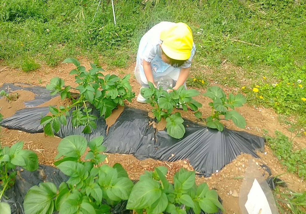 最初は公園に行く前に畑へ寄り、水やりをしていた子どもたちでしたが、水をあげると成長することが分かると、徐々に水やりをするために畑に行くようになりました。水やりの回数を重ねるうちに水やりも段々上手になり、ジャガイモの根を目掛けて水量を調整しながら水をあげられるようになりました。