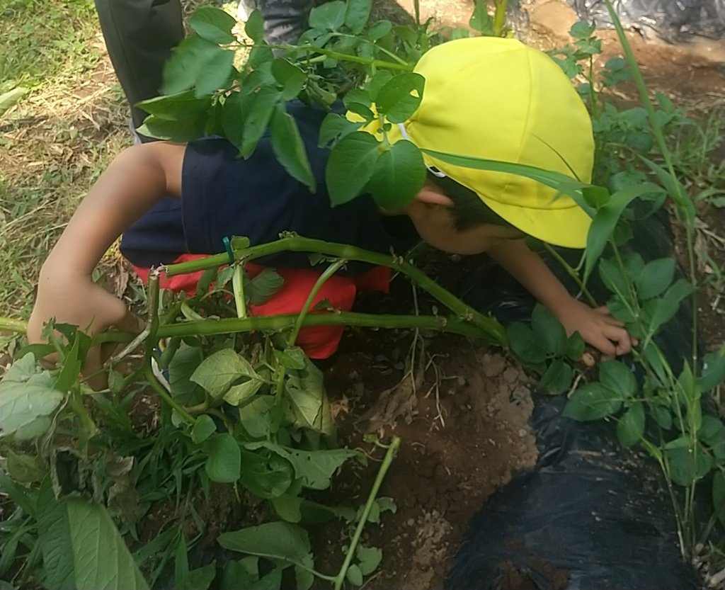 収穫の日は、畑に向かう道中でどのような料理を作りたいかを子どもたちに聞きました。「カレー」、「ポテト」、「スープ」など様々な意見が上がりました。スコップを使って土の中のジャガイモを探し、収穫したジャガイモを見て「大きい」、「泥が付いている」と感想を言います。ジャガイモが見つからない友達に「ここにあるよ」と年上の子どもが教える場面も見られました。